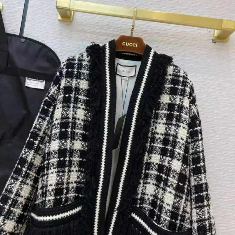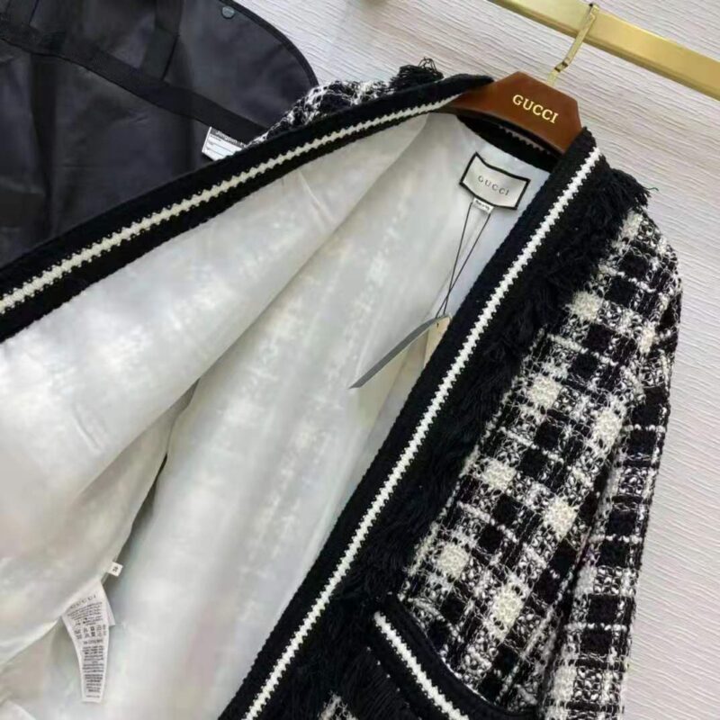 Gucci Women Tweed Jacket Ivory and Black Check Tweed Black Ribbon Wool