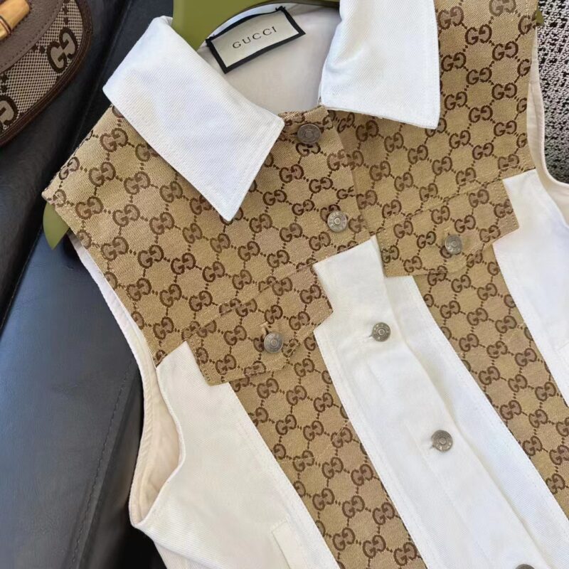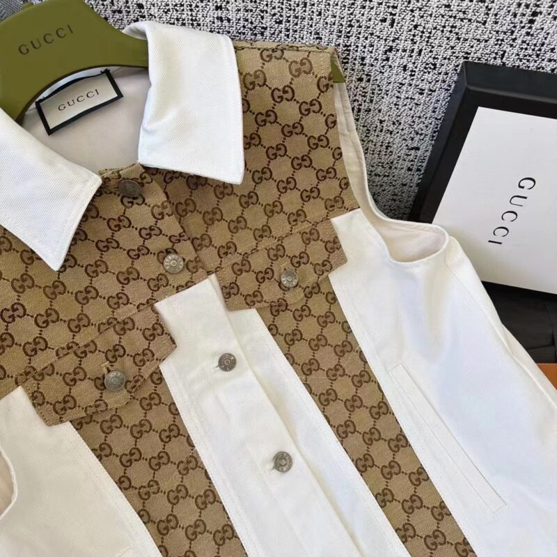Gucci Women Washed Organic Denim Vest GG Light Blue Stone Bleached Point Collar Sleeveless