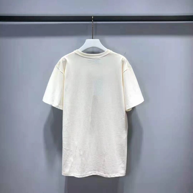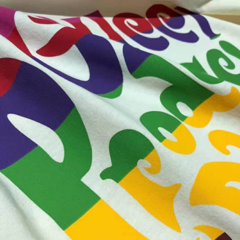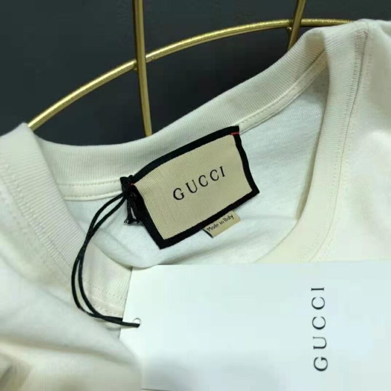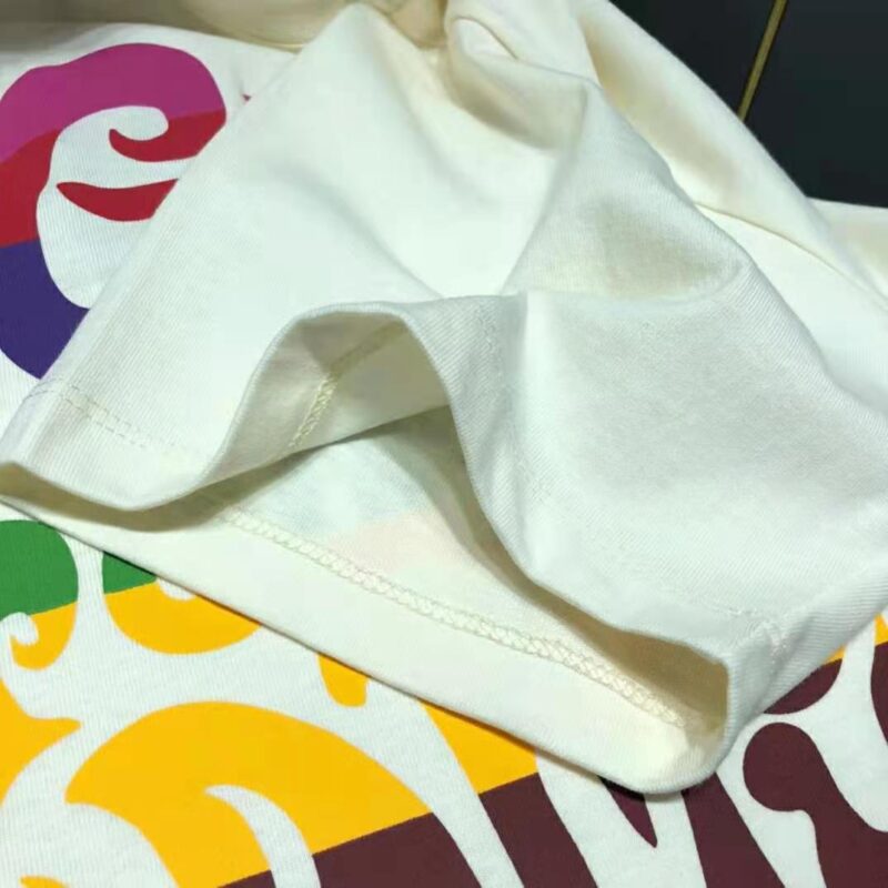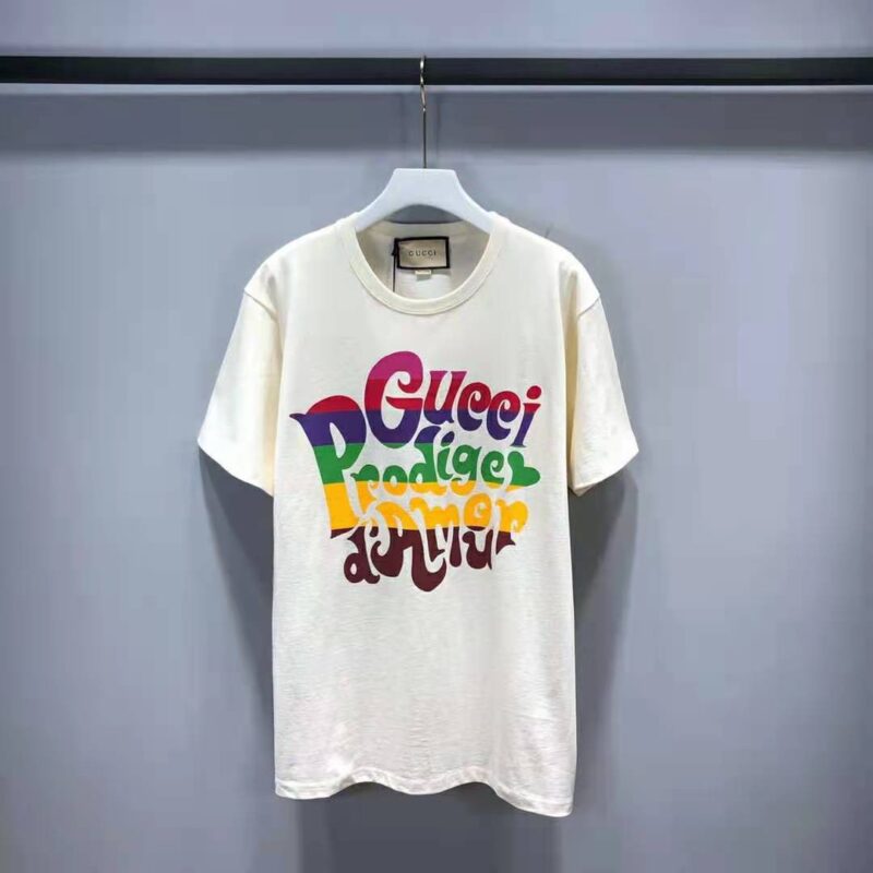 - Conveying the ideas of love and inclusivity that run throughout the House’s narrative, the multicolor Gucci Prodige d’Amour print adds a splash of color to this T-shirt, crafted from off-white cotton jersey and designed with an oversize fit.