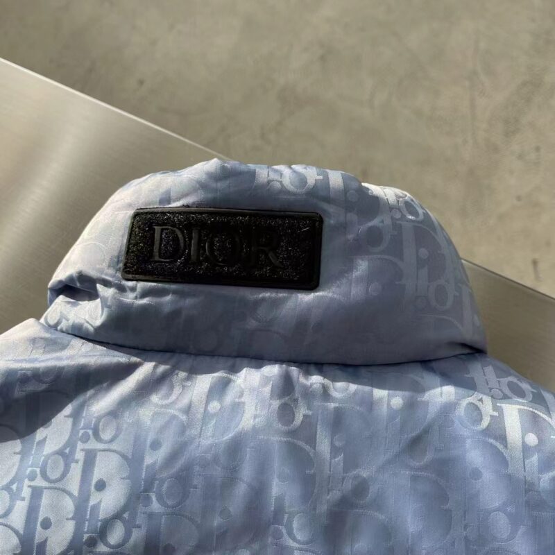 - Den blå dunvästen hyllar det karakteristiska ton-i-ton-mönster från Dior Oblique.
