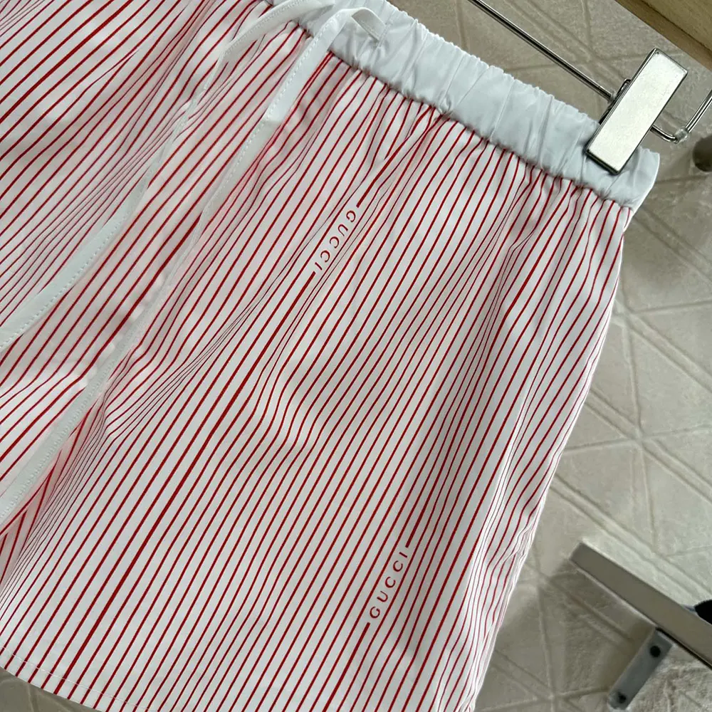 - The Gucci logo makes a subtle appearance as part of a striped cotton fil coupé material defining this pair of shorts.