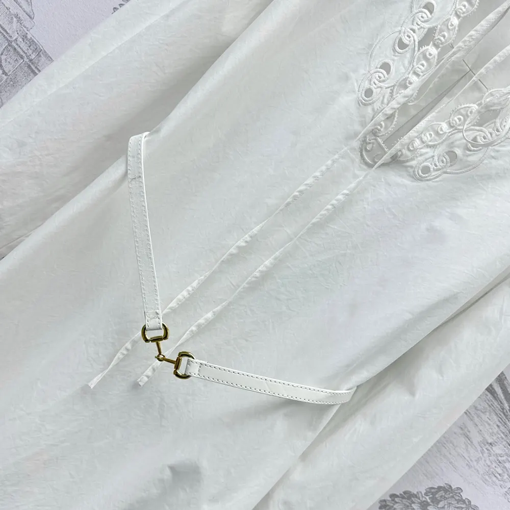 - This cotton poplin dress features a cut-out Marina Chain embroidered neckline and a detachable leather belt with the Horsebit hardware.