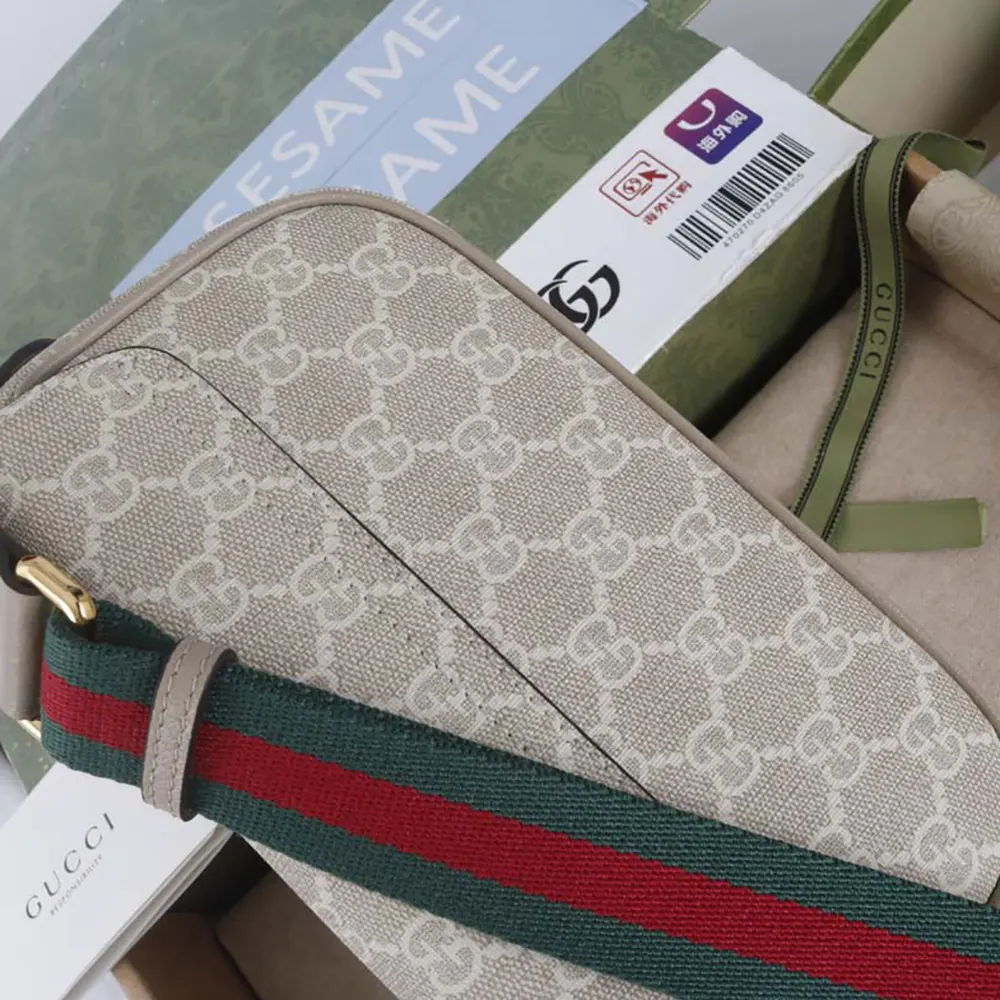 - Randen, som porträtteras i sin mest anmärkningsvärda kombination av grönt och rött, löper längs mitten av en axelväska i GG Supreme-canvas.
