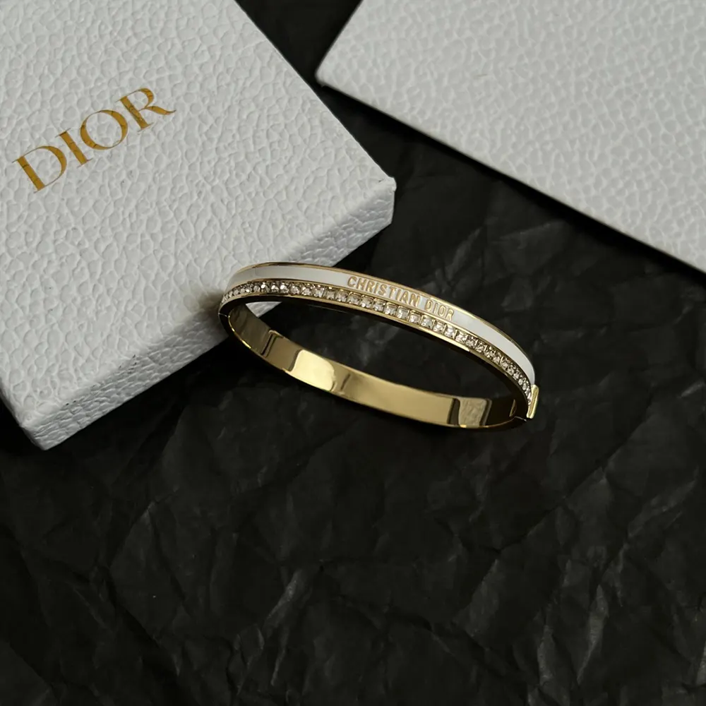 The rigid gold-finish metal design showcases the Christian Dior signature over white lacquer, enhanced by a row of sparkling white crystals.