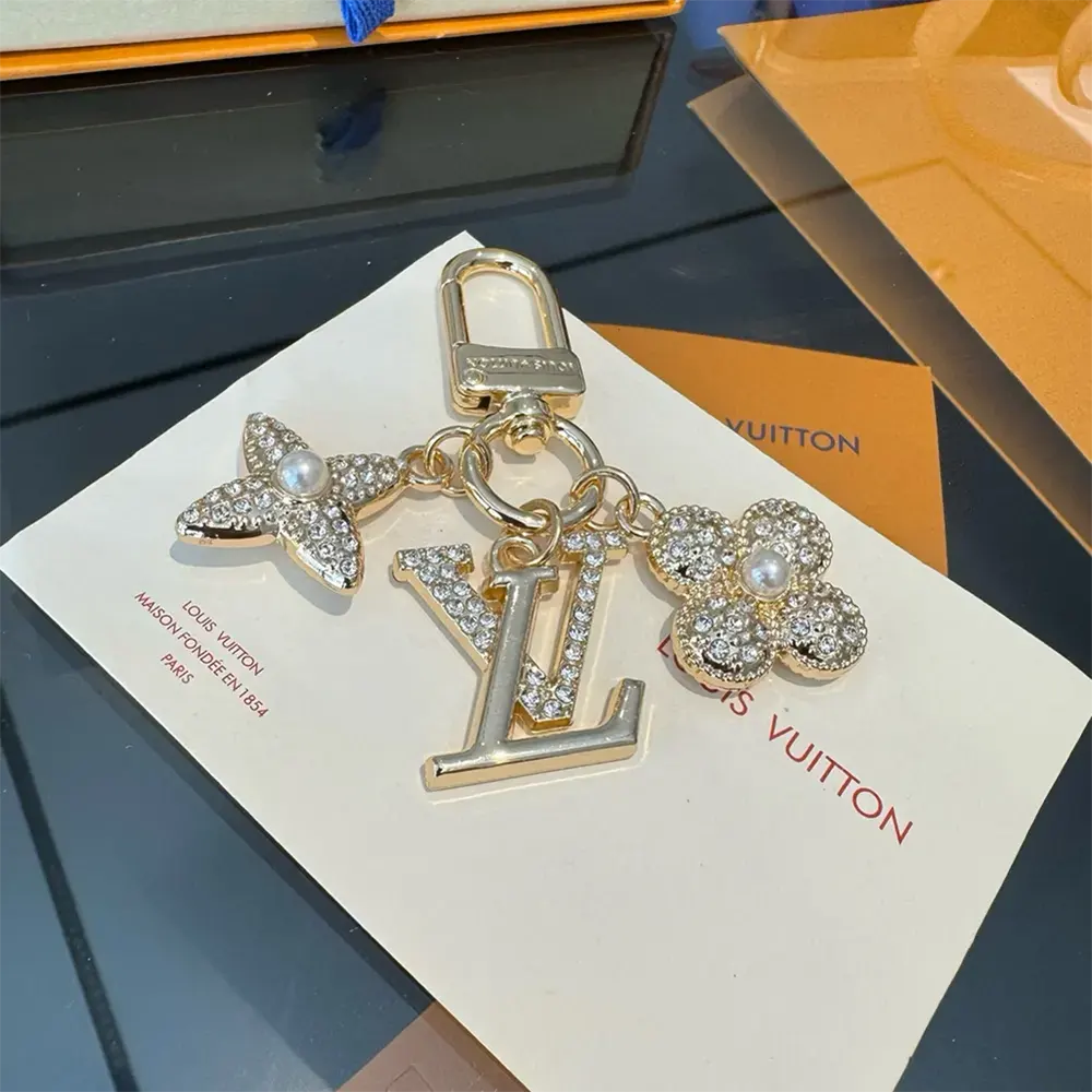 The gold-tone metal snap hook holds a trio of House emblems: the LV Initials plus two different Monogram Flowers,