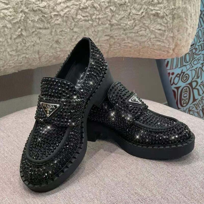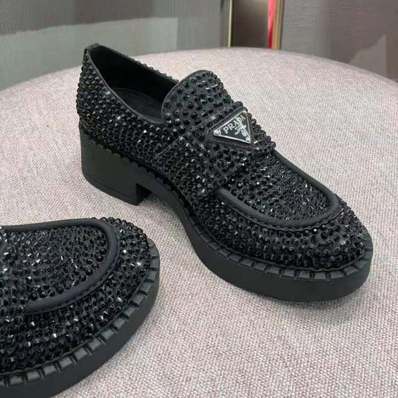 Prada Women Chocolate Satin Loafers with Crystals-Black
