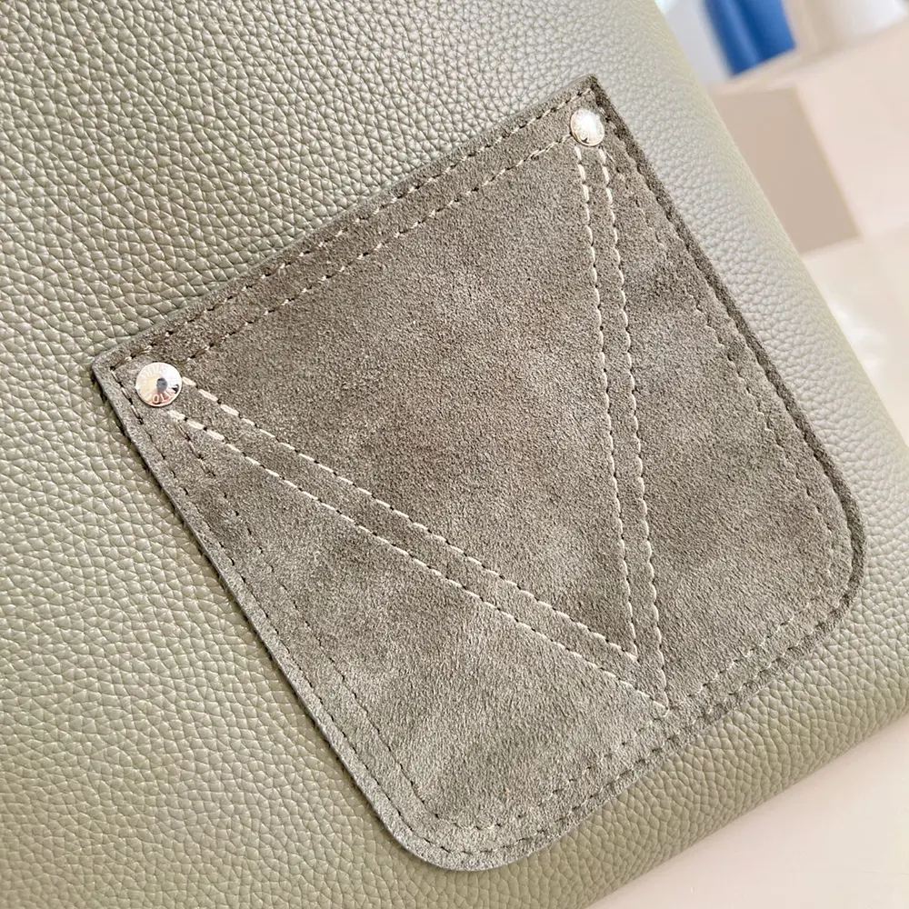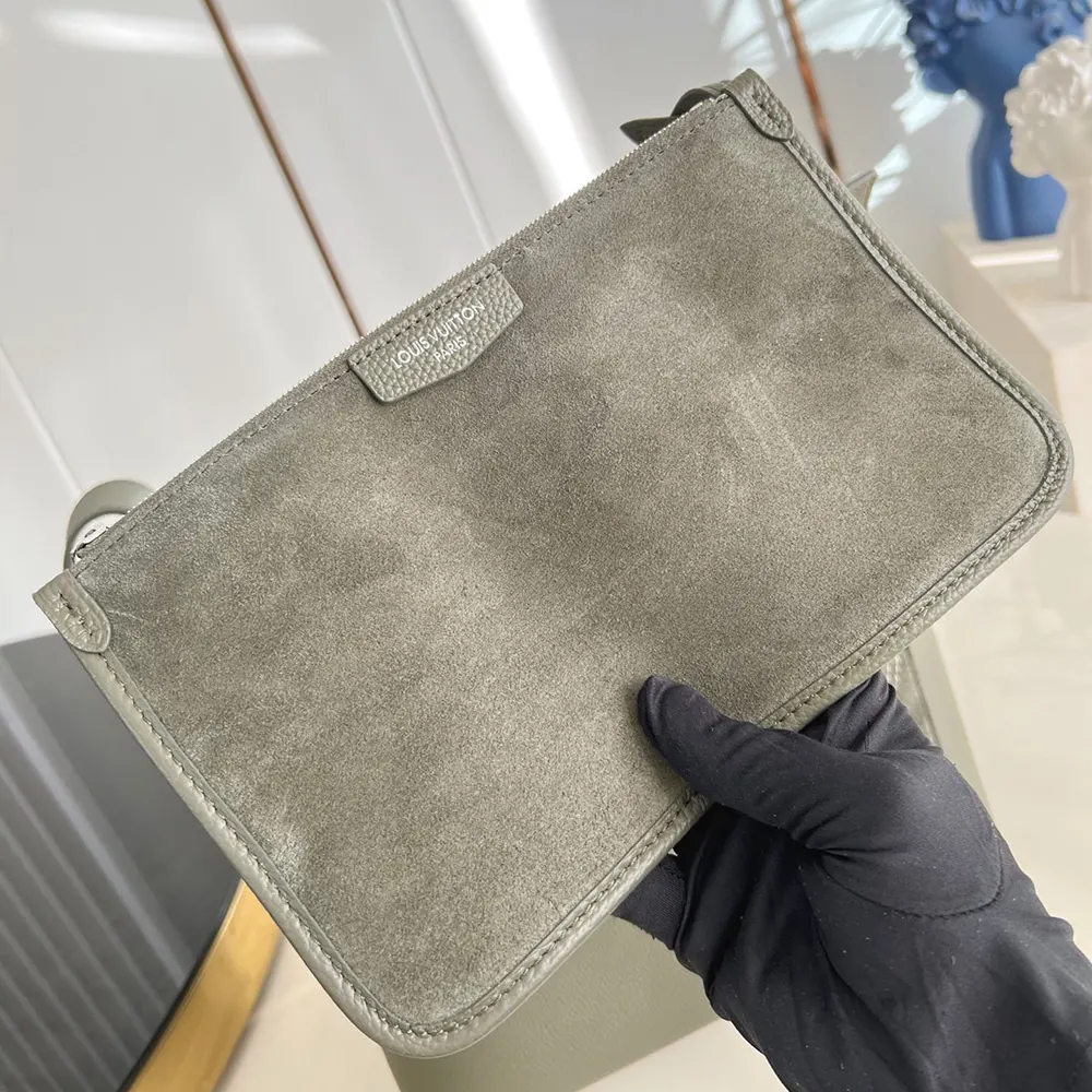 - Each side features a pocket with a discreet stitched V signature, while a removable suede pouch adds extra functionality.
