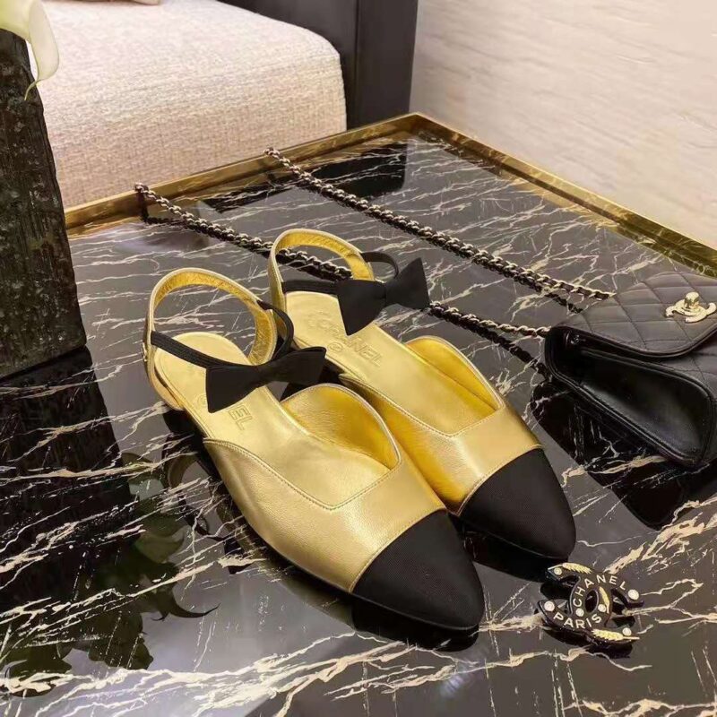 Mary Janes Chanel para mujer en piel de cordero laminada y grogrén dorado y negro, tacón de 1 cm