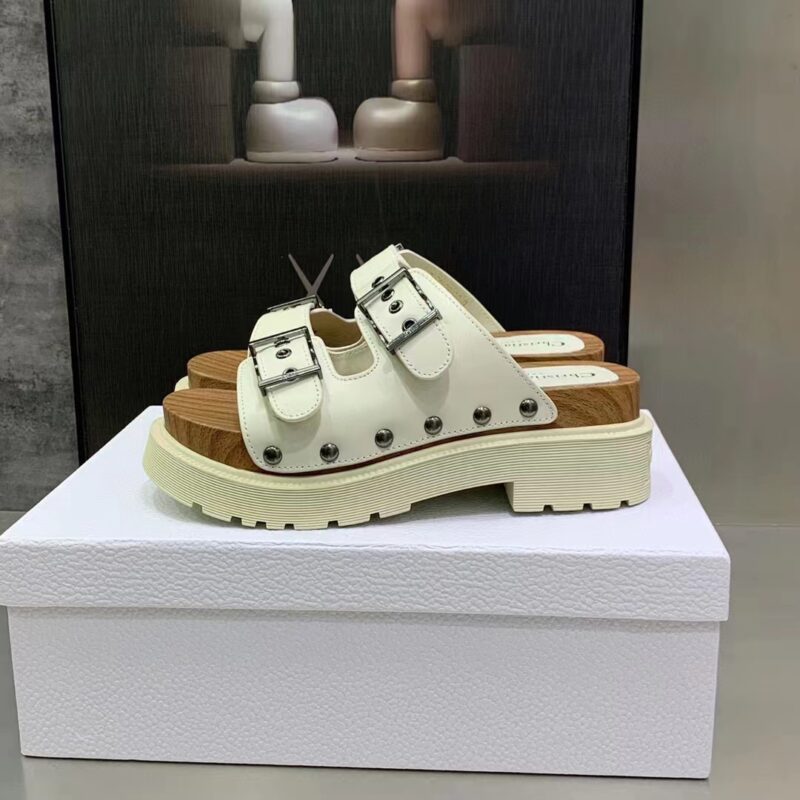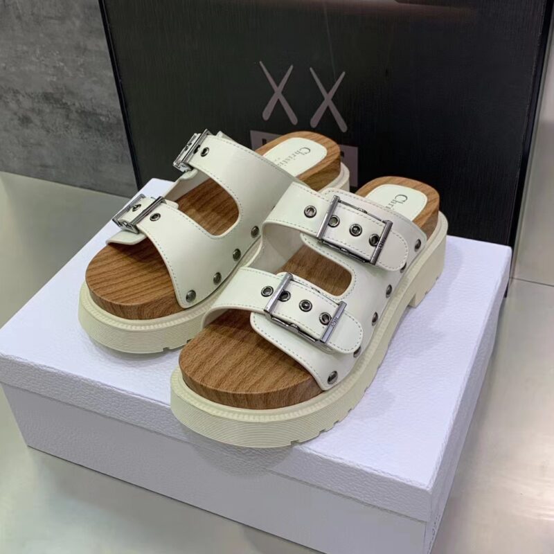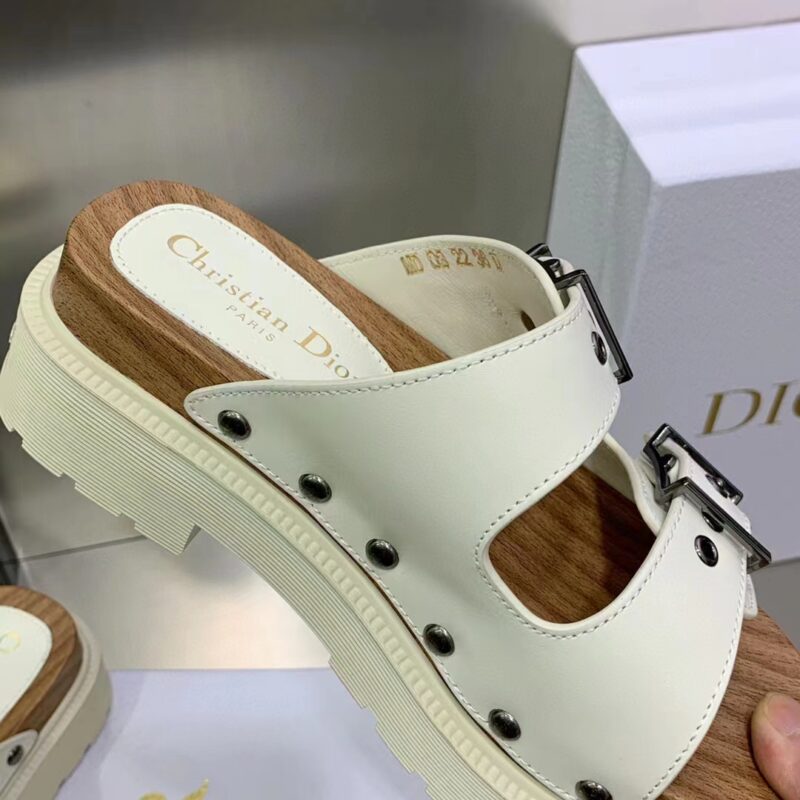 Dior Women Shoes CD Diorquake Strap Slide White Calfskin Wooden Insole