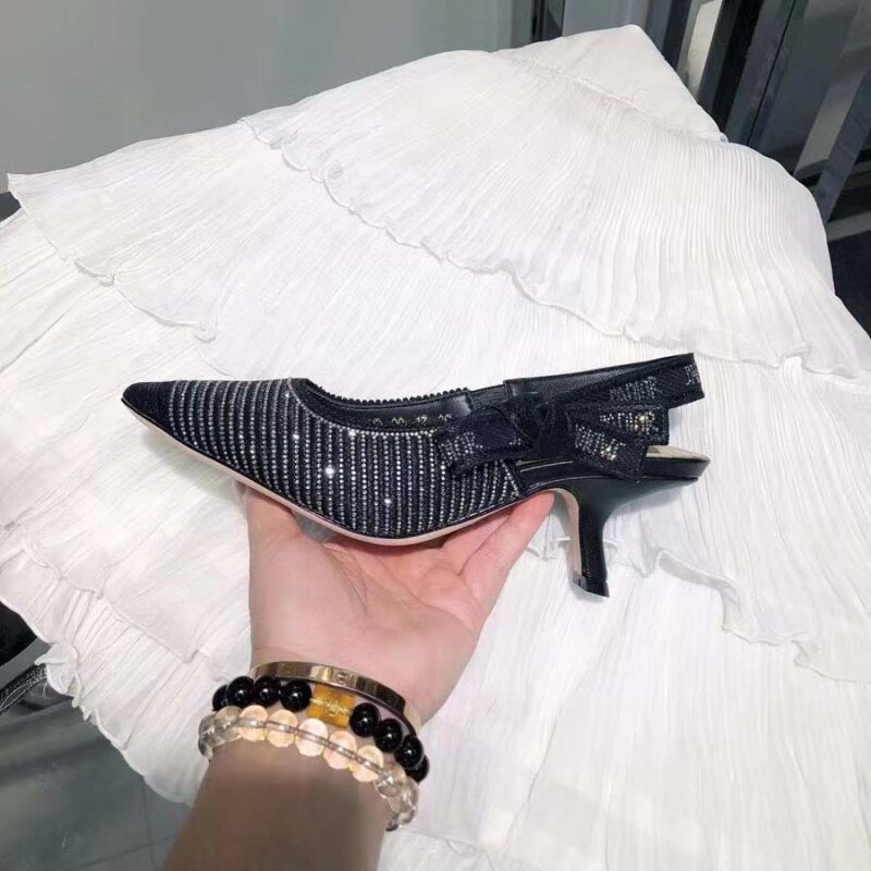 - Confectionnée dans les ateliers italiens de Christian Dior, la silhouette à bout pointu est proposée dans une broderie en coton noir ornée de strass argentés.