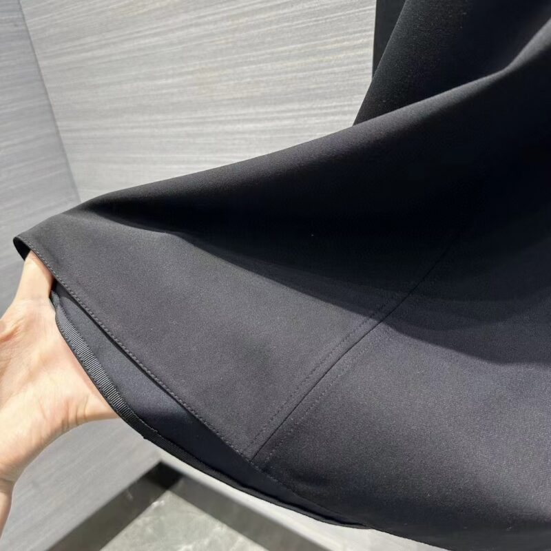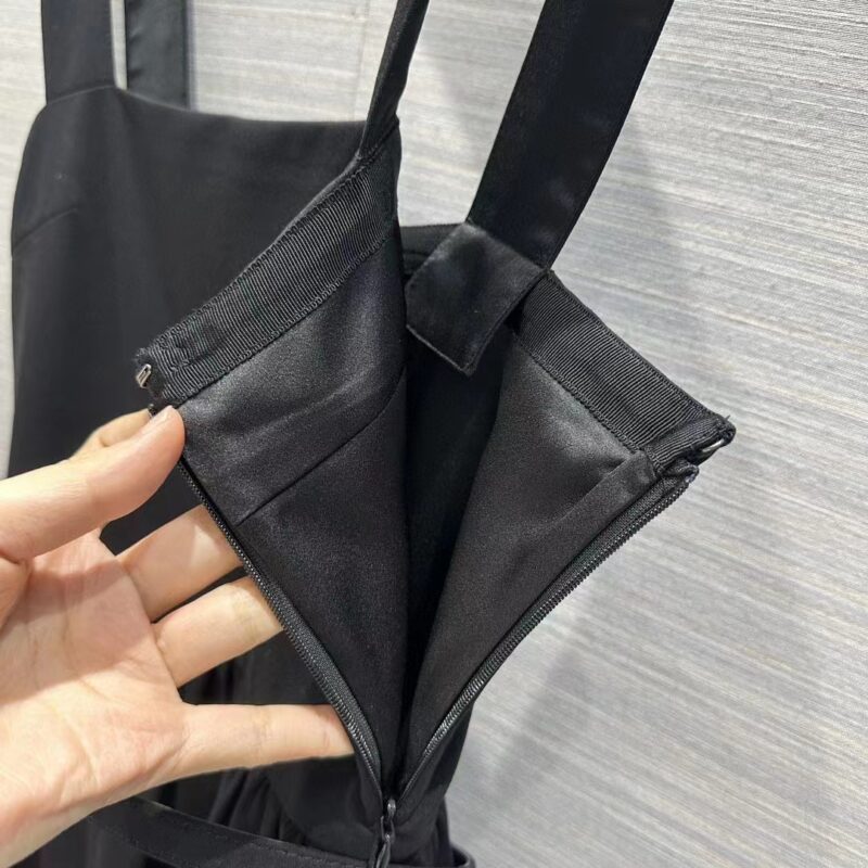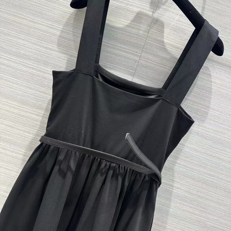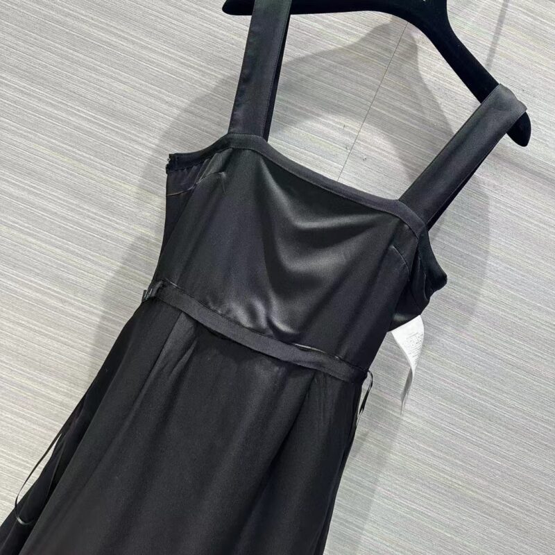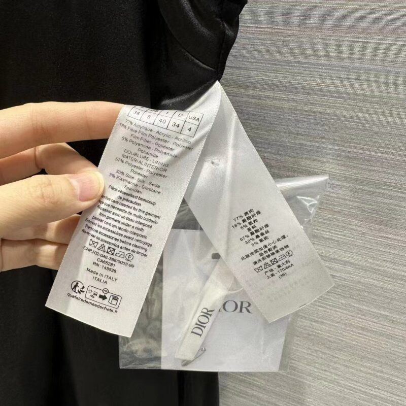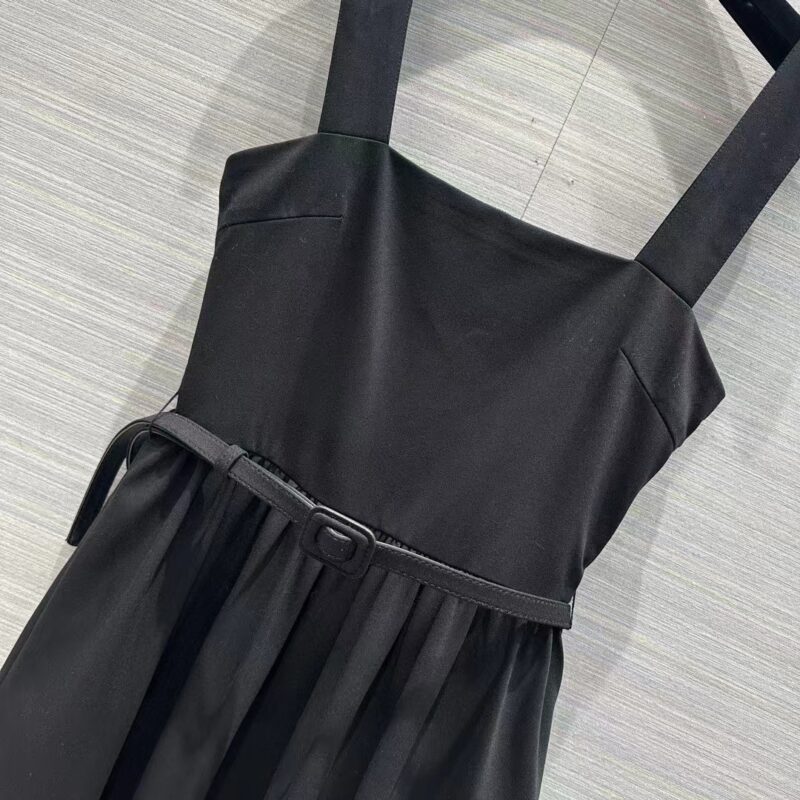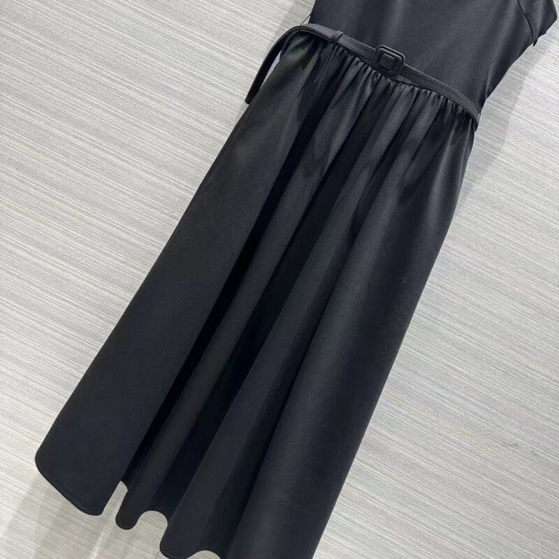 - The dress honors the House’s codes of elegance. Crafted in lightweight black wool and silk, it presents a flared silhouette enhanced by a tonal belt highlighting the waist.