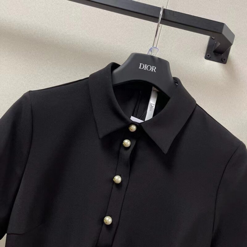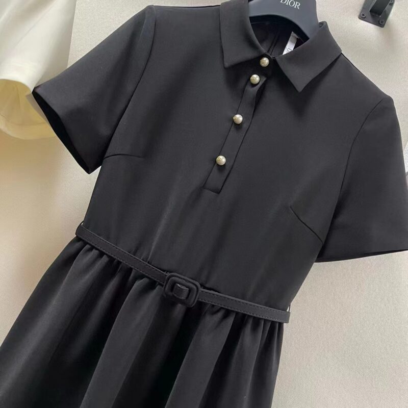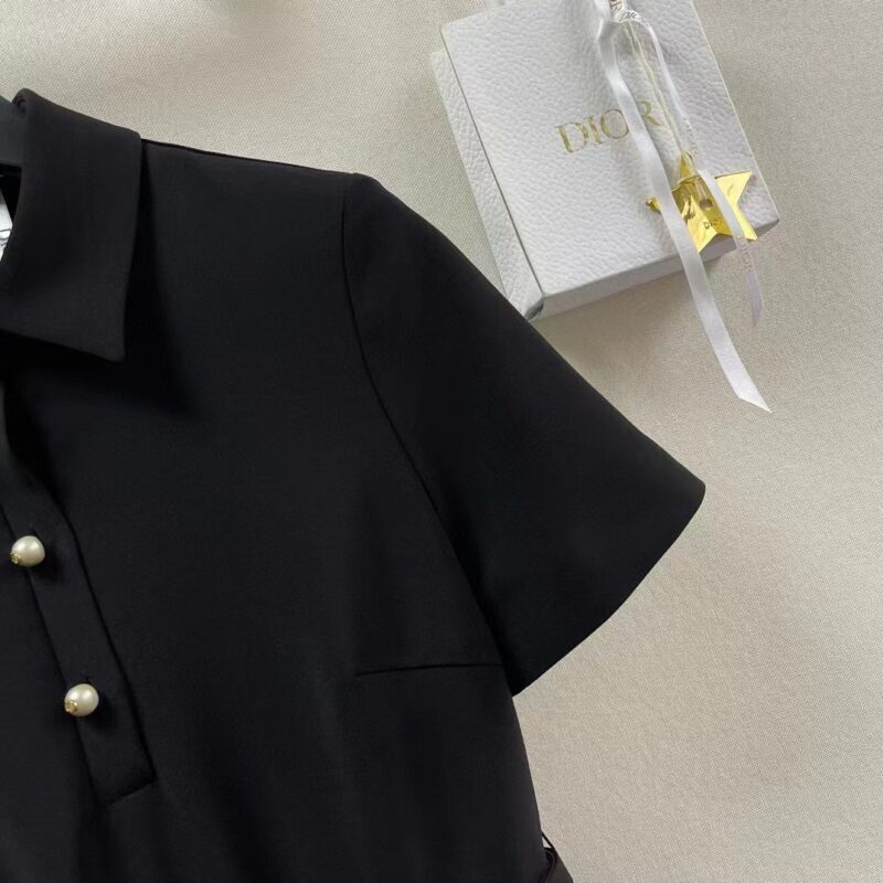 - Crafted in black lightweight wool and silk, it is distinguished by a flared cut embellished with Dior Tribales buttons, showcasing a resin pearl and CD signature inspired by the iconic House earring. Completed by a tonal belt highlighting the waist, the short-sleeved dress will create contemporary, refined looks.