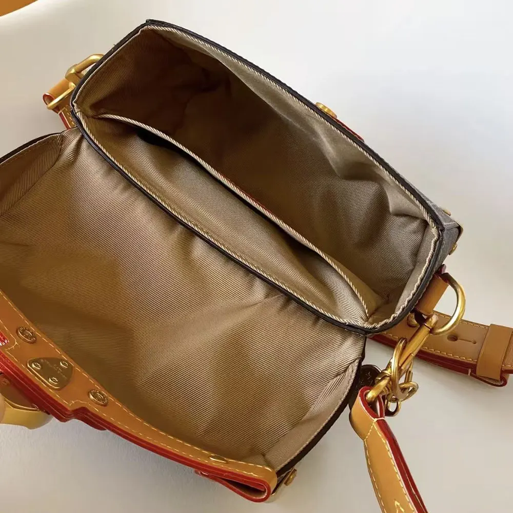 - This compact bag from Pharrell Williams boasts all the codes of the Soul Trunk family: reinforced corners, stitching, leather details, and the tumbler lock.
