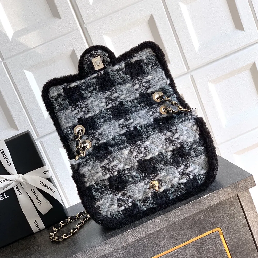 Chanel Women Large Flap Bag Tweed Shearling Lambskin Gold Tone Metal-Black