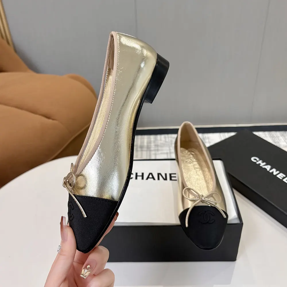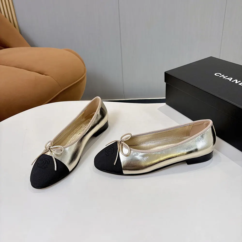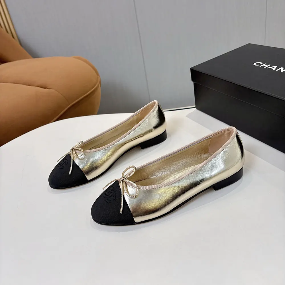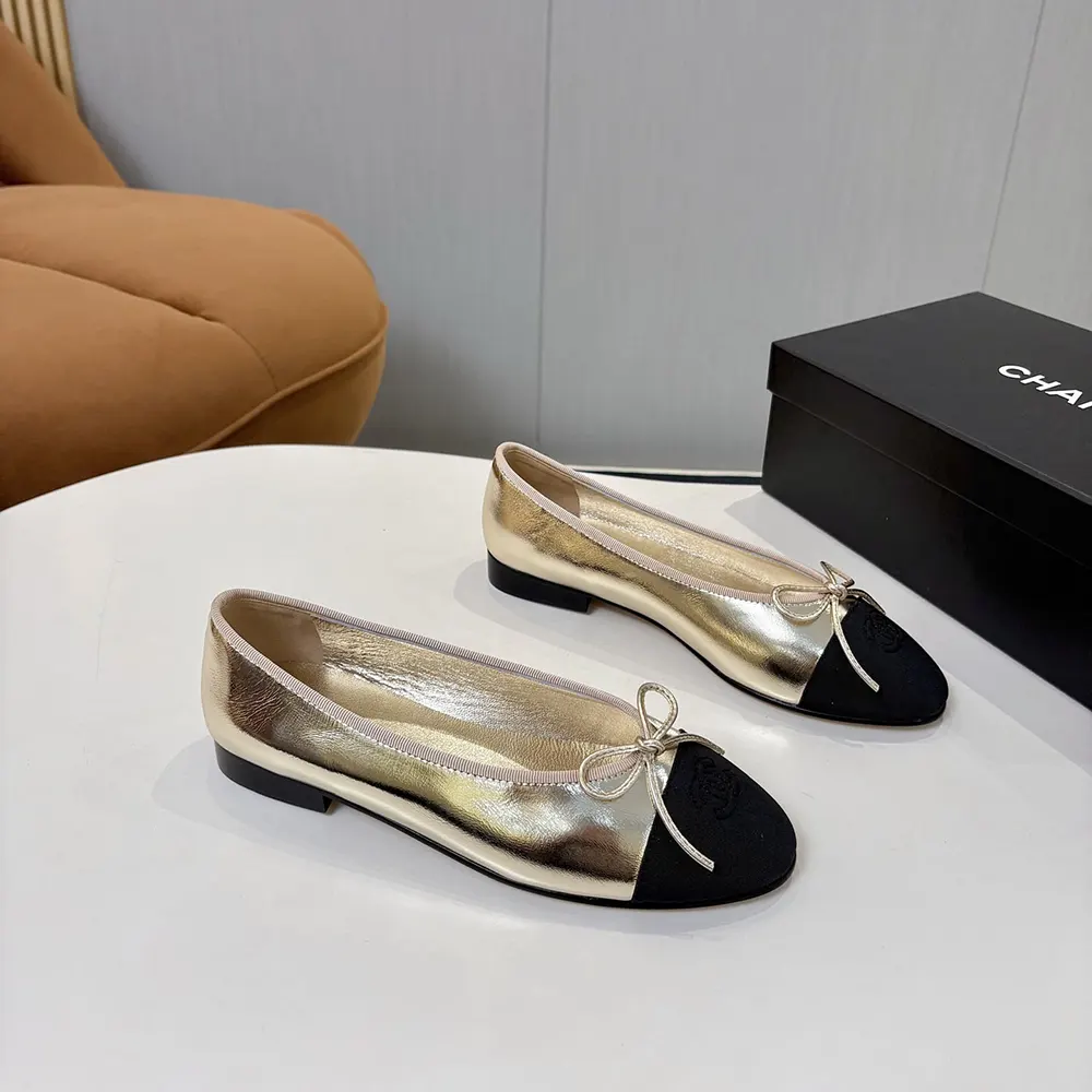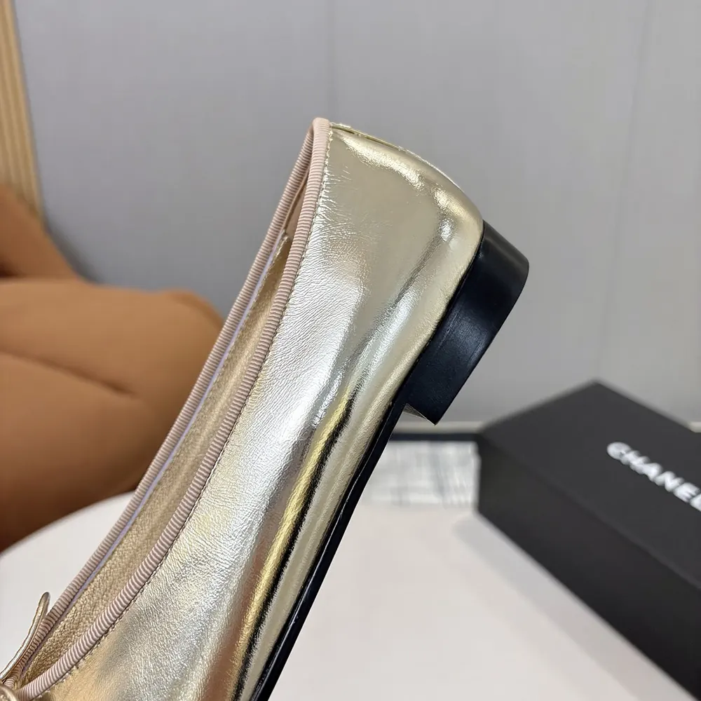 Chanel Women Ballet Flats Laminated Lambskin & Grosgrain-Light Gold G02819