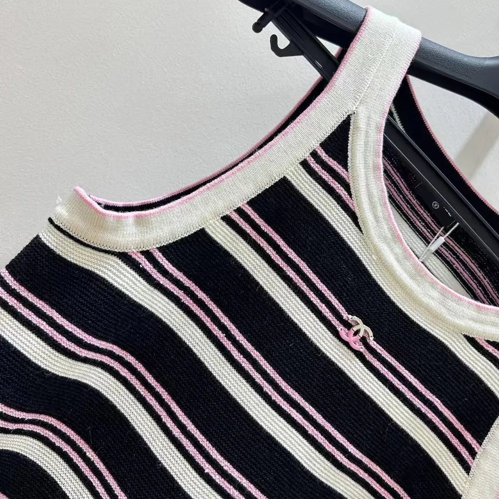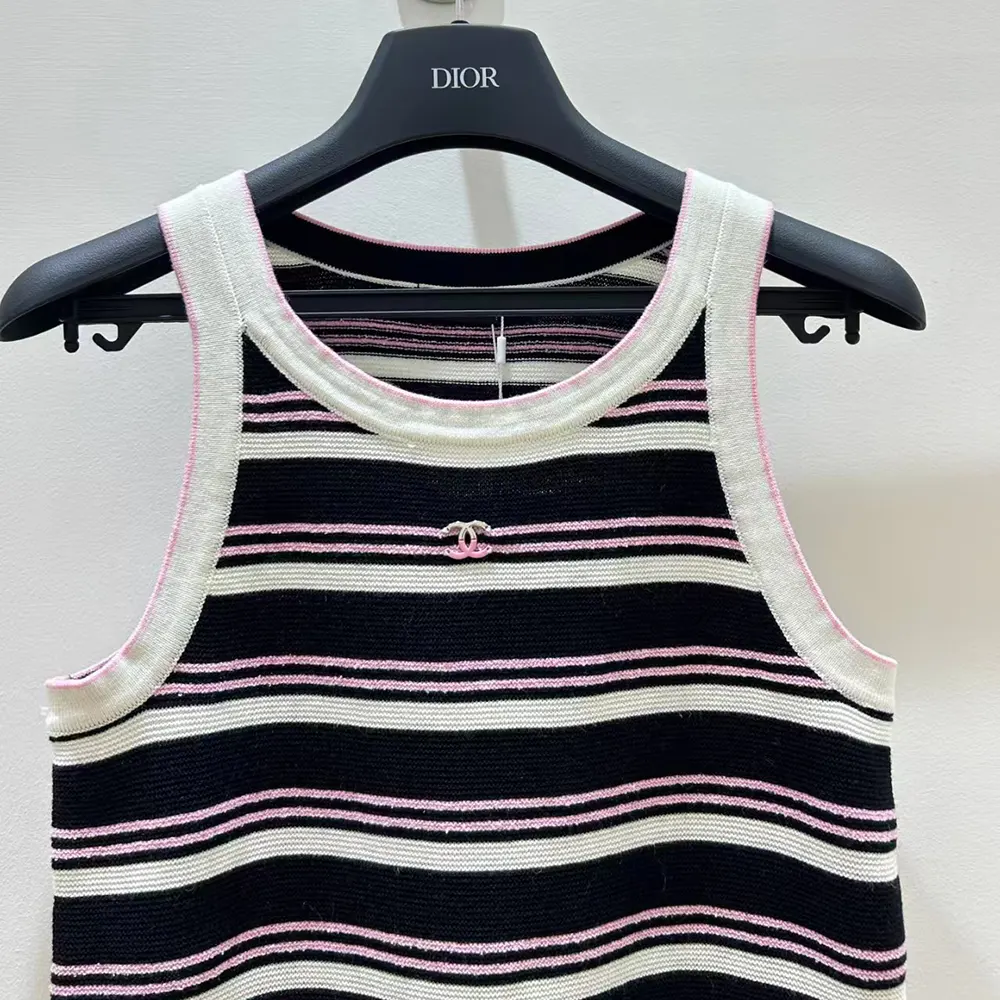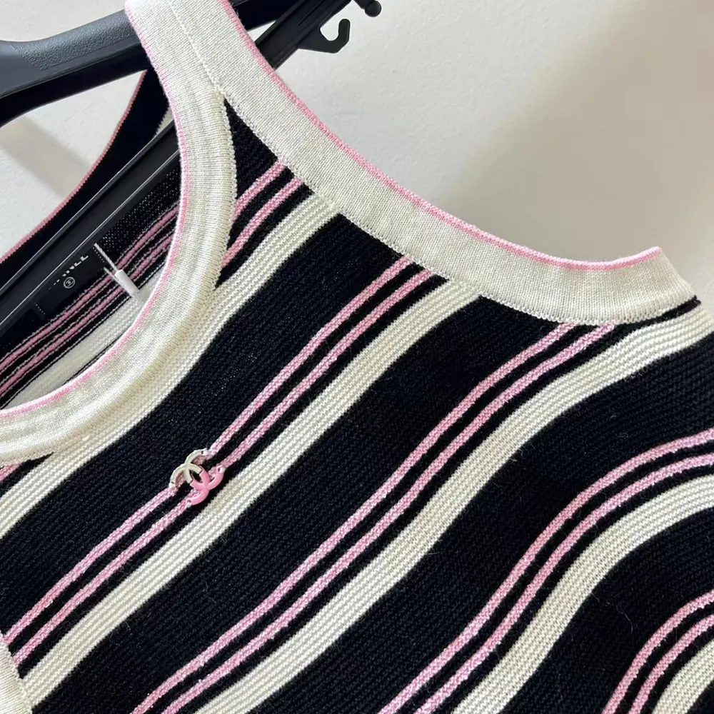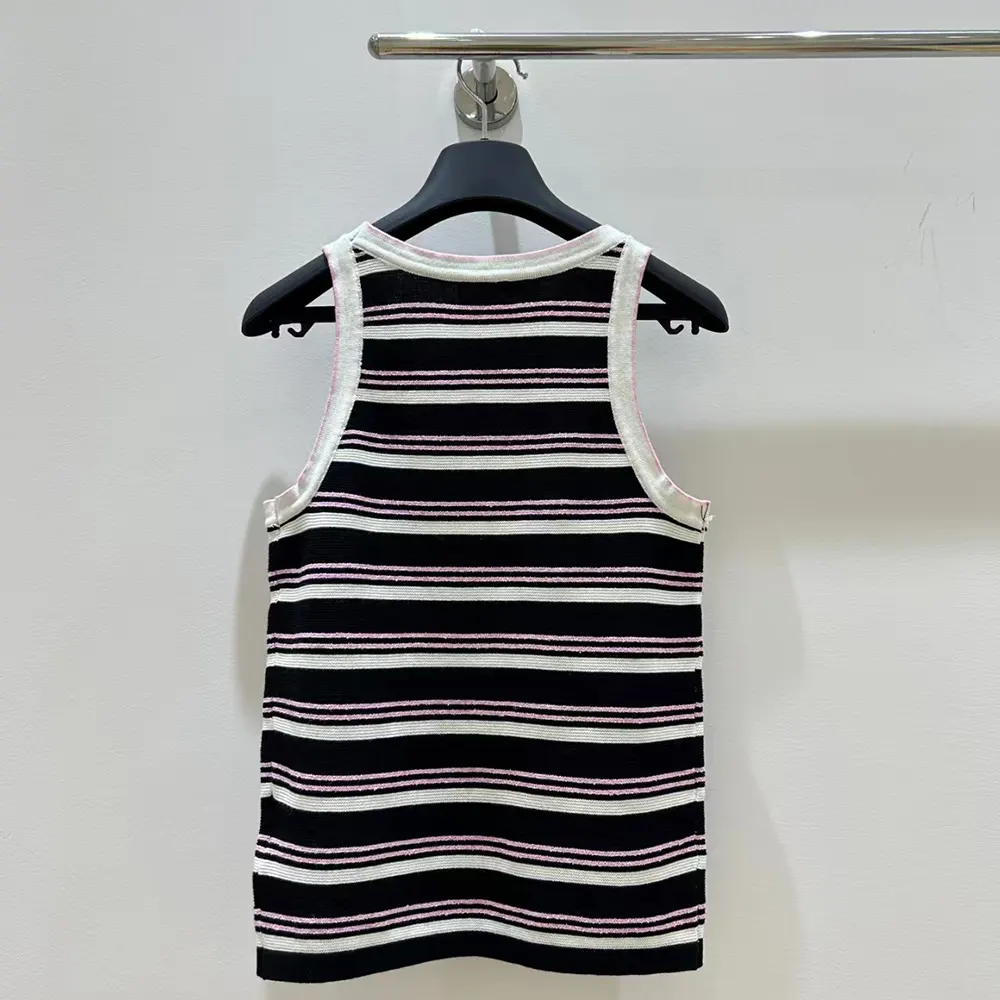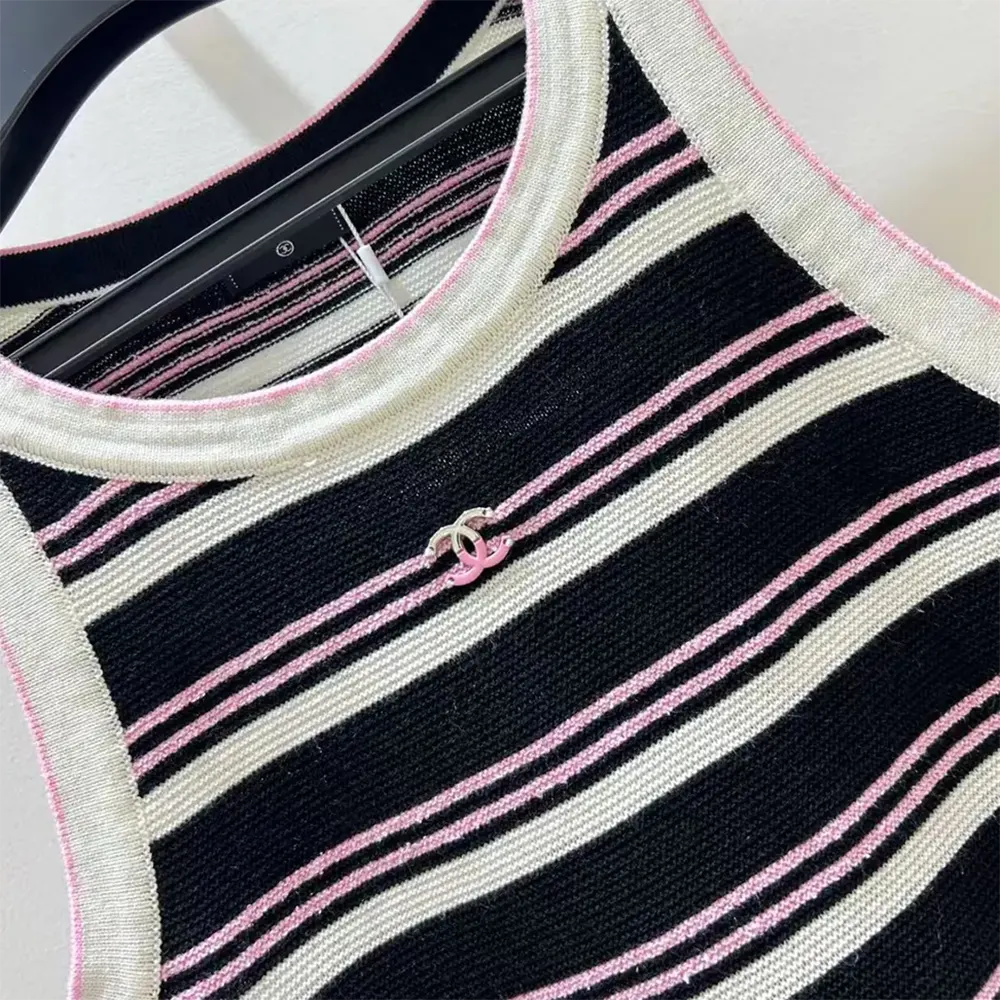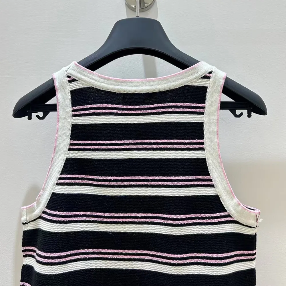 Chanel Women Black and White Striped Tank Top with Pink Detail