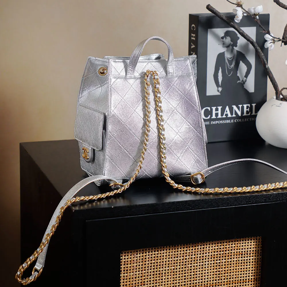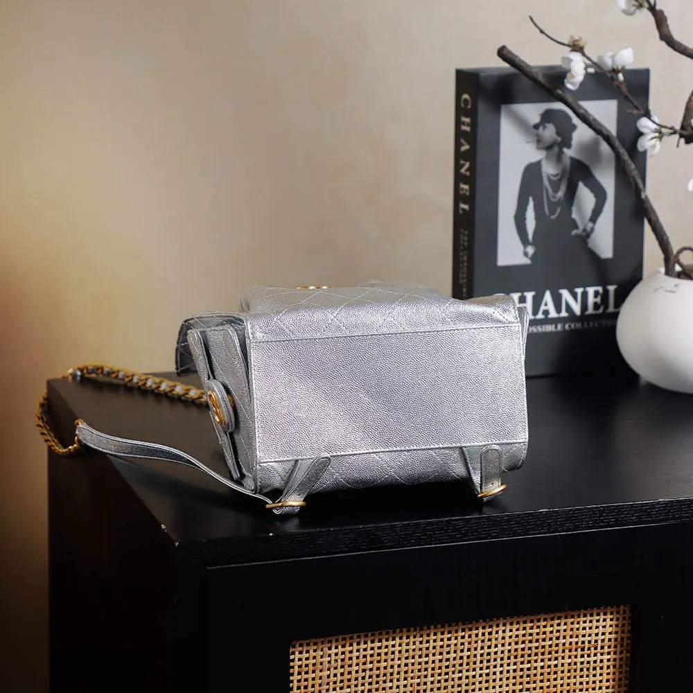 Chanel Women Chanel 25 Medium Backpack Grained Calfskin & Gold-Tone Metal-Silver