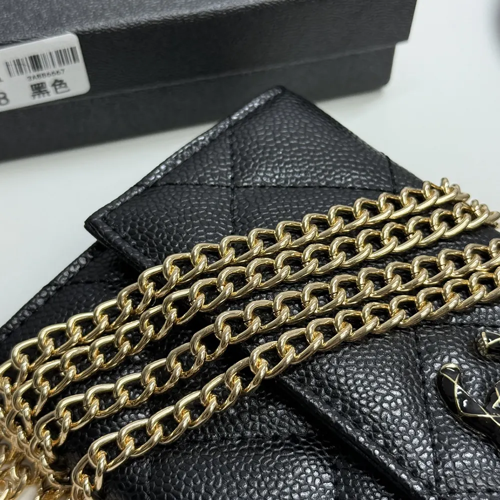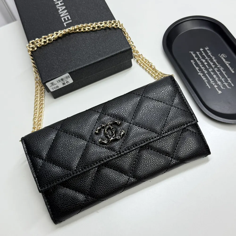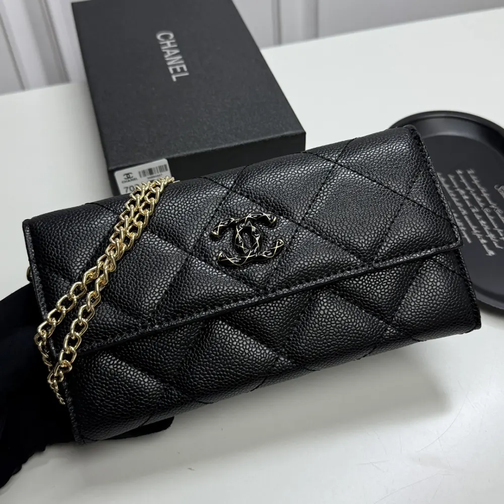Chanel Women Classic Wallet with Chain Grained Shiny Calfskin Gold Tone Metal-Black