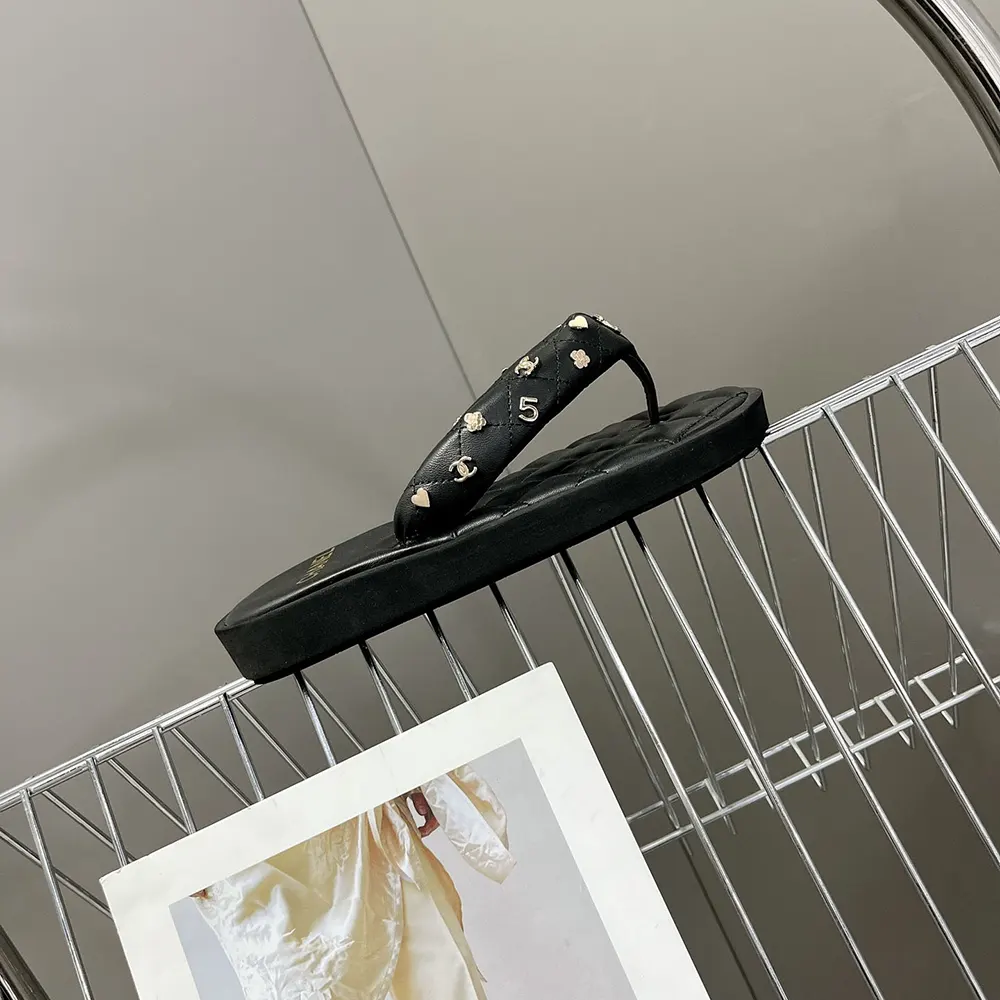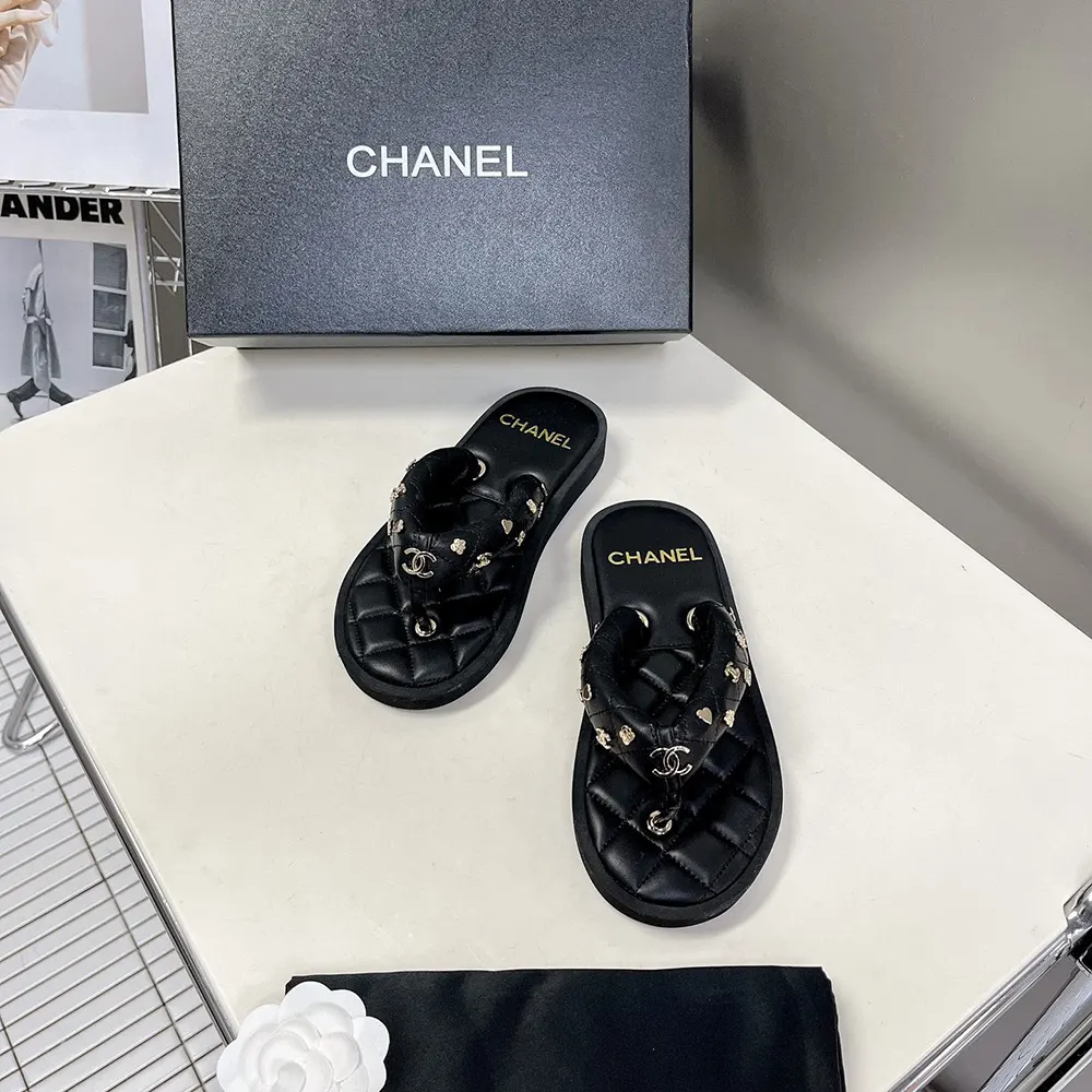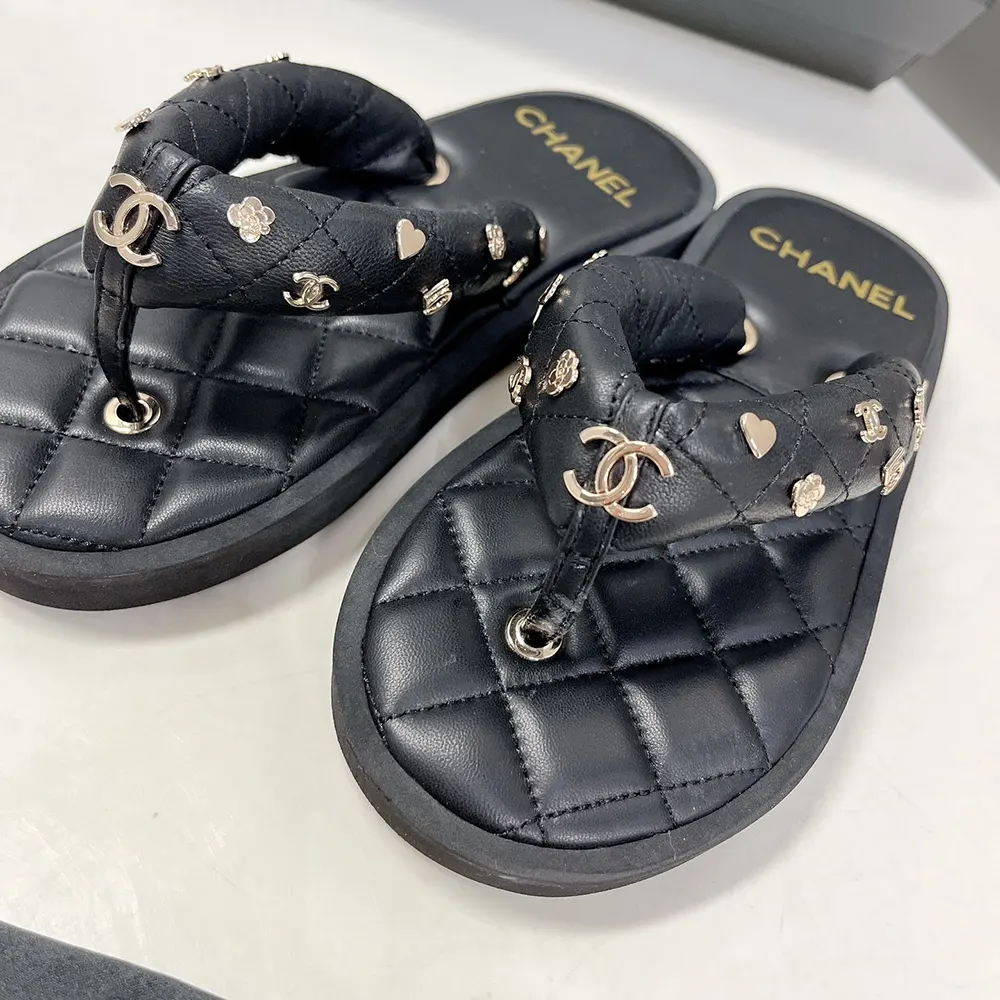 Chanel Women Lambskin Quilted Padded Charms Thong Sandals-Black