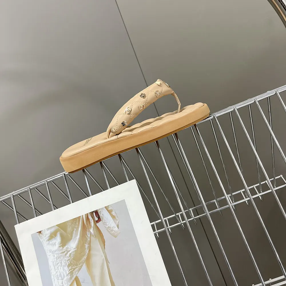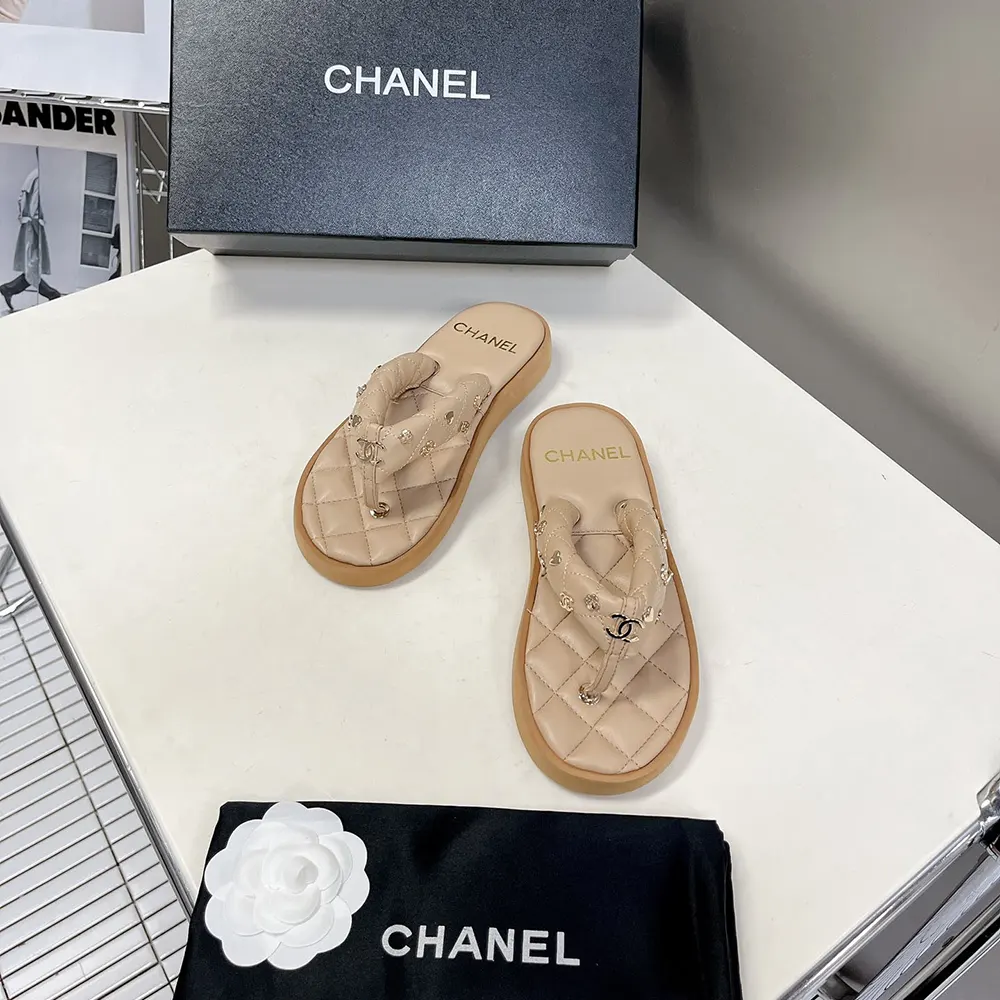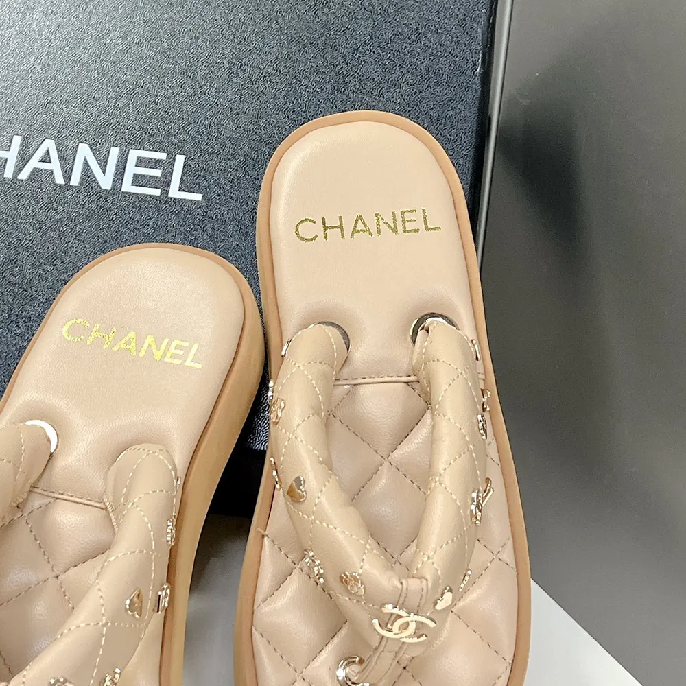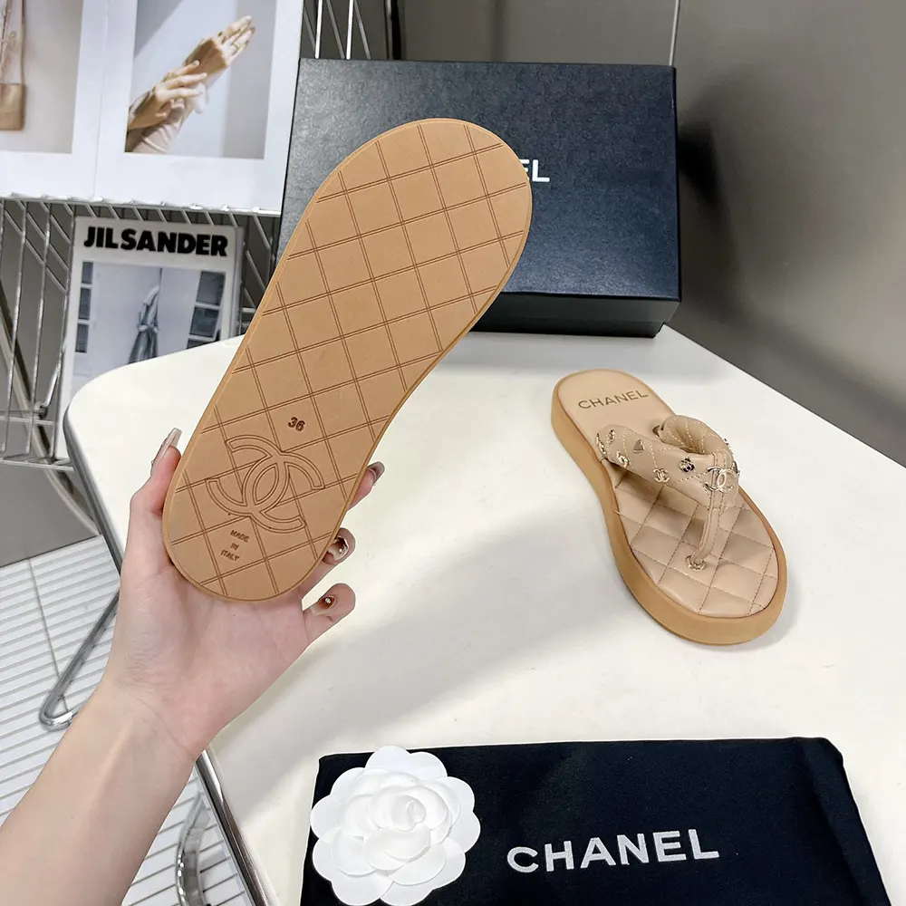 Chanel Women Lambskin Quilted Padded Charms Thong Sandals-Sandy