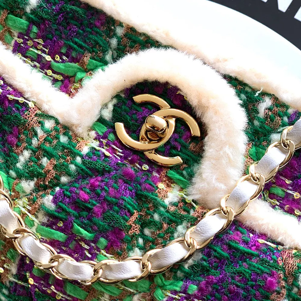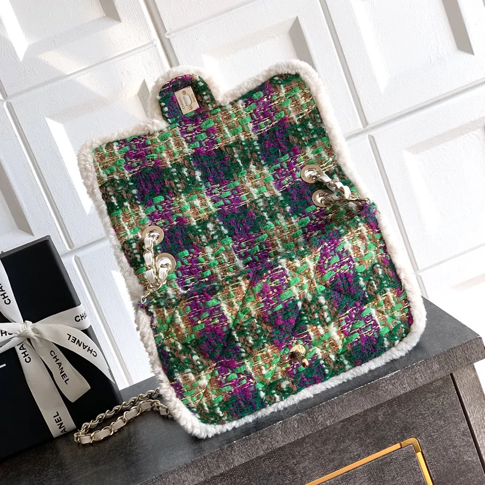 Chanel Women Large Flap Bag Tweed Shearling Lambskin Gold Tone Metal-Green