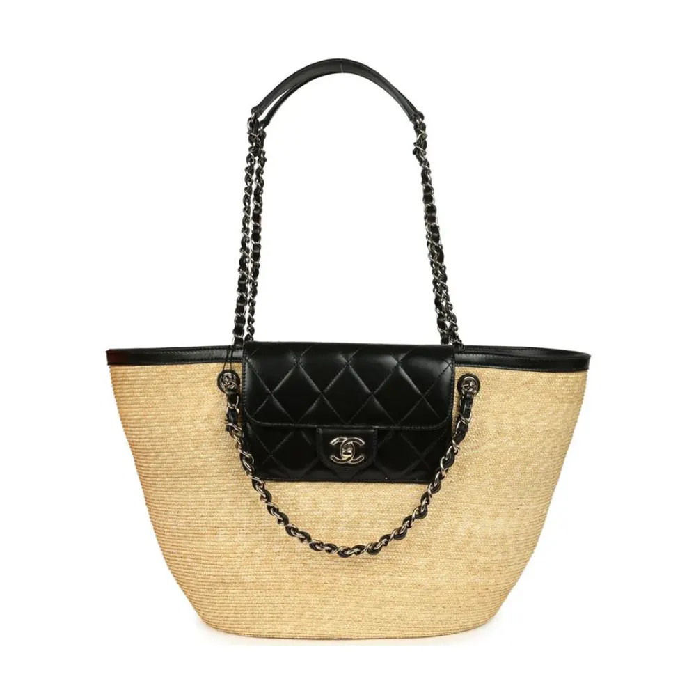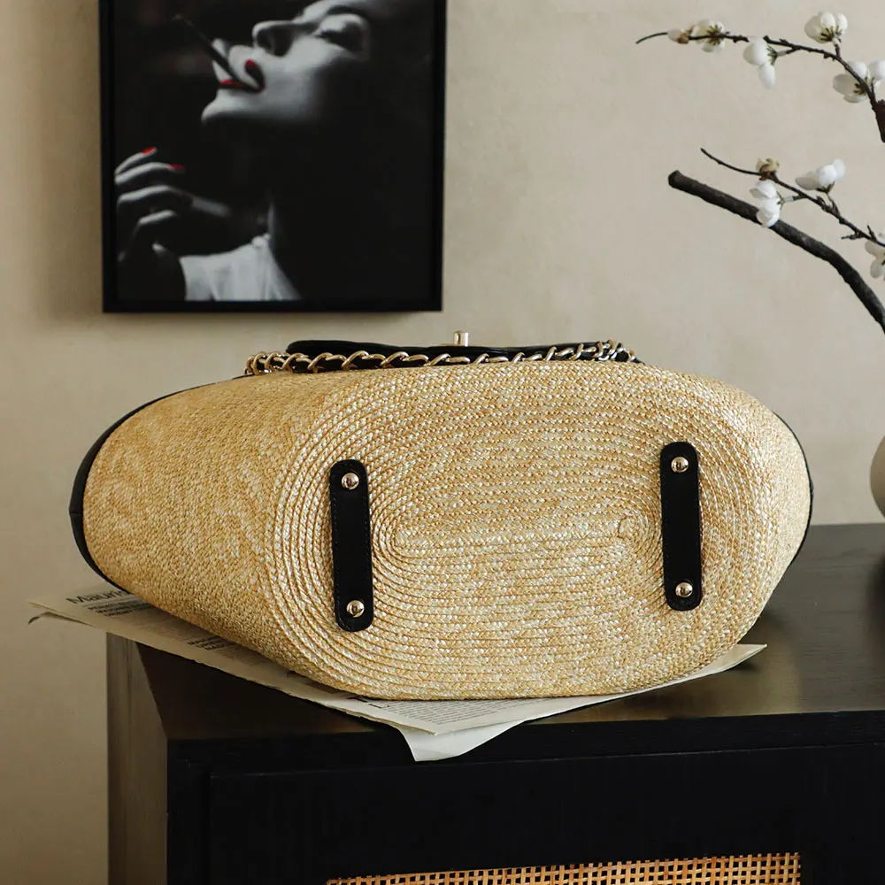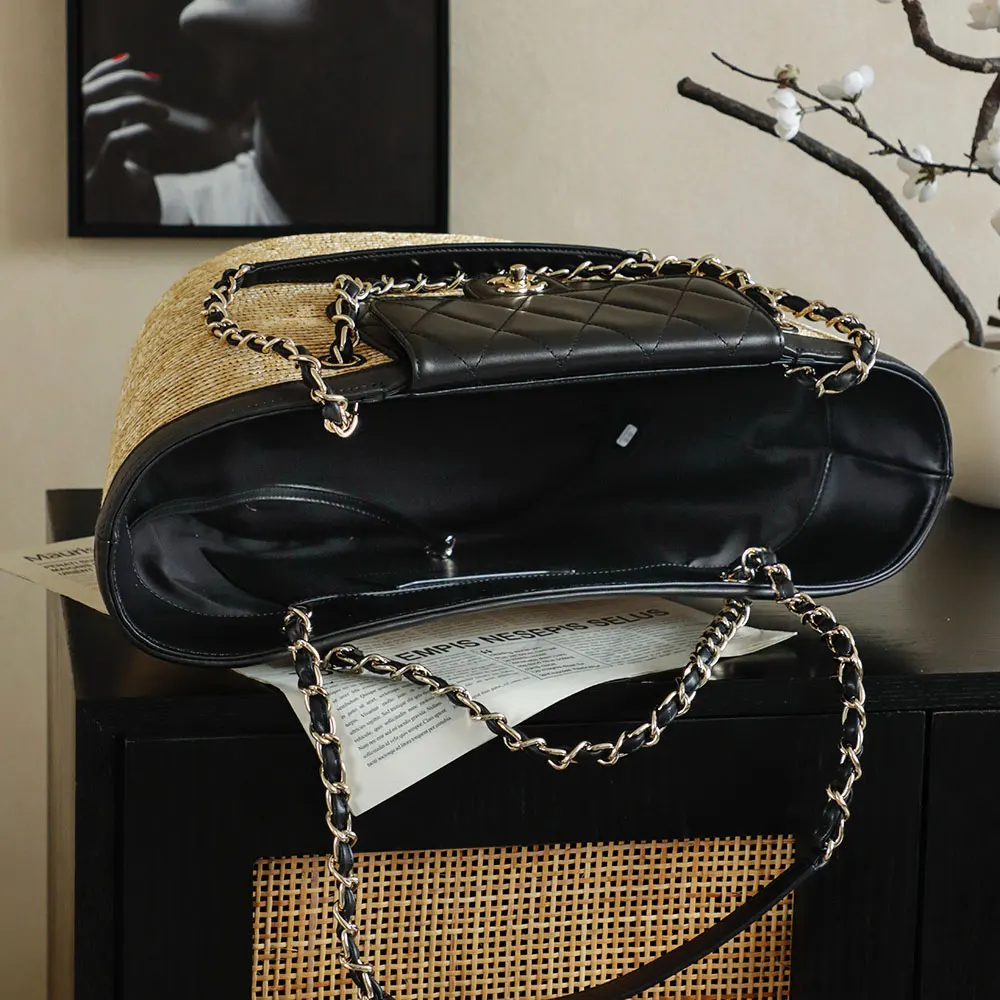 Chanel Women Large Shopping Bag Braided Straw Lambskin & Gold-Tone Metal-Black