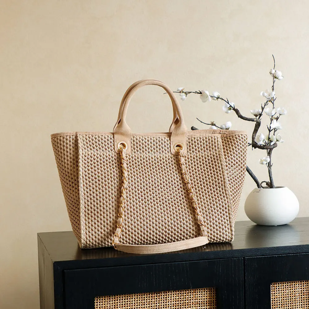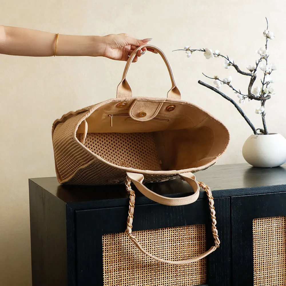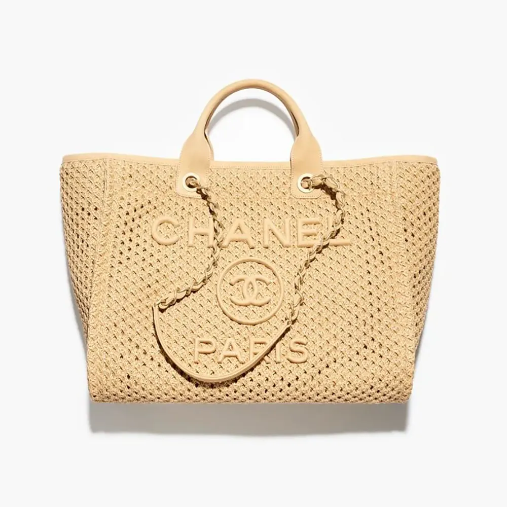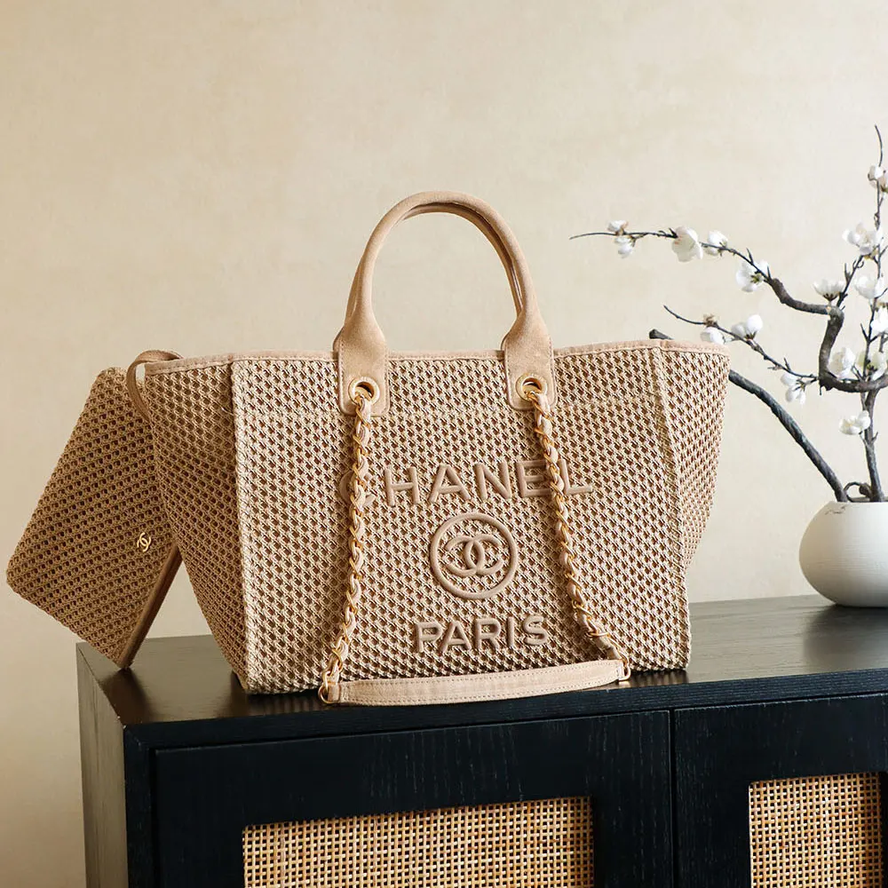 Chanel Women Large Shopping Bag Braided Straw Suede Calfskin & Gold-Tone Metal