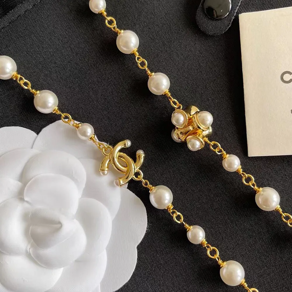 Chanel Women Long Necklace Metal & Glass Pearls Gold & Pearly White ABH230