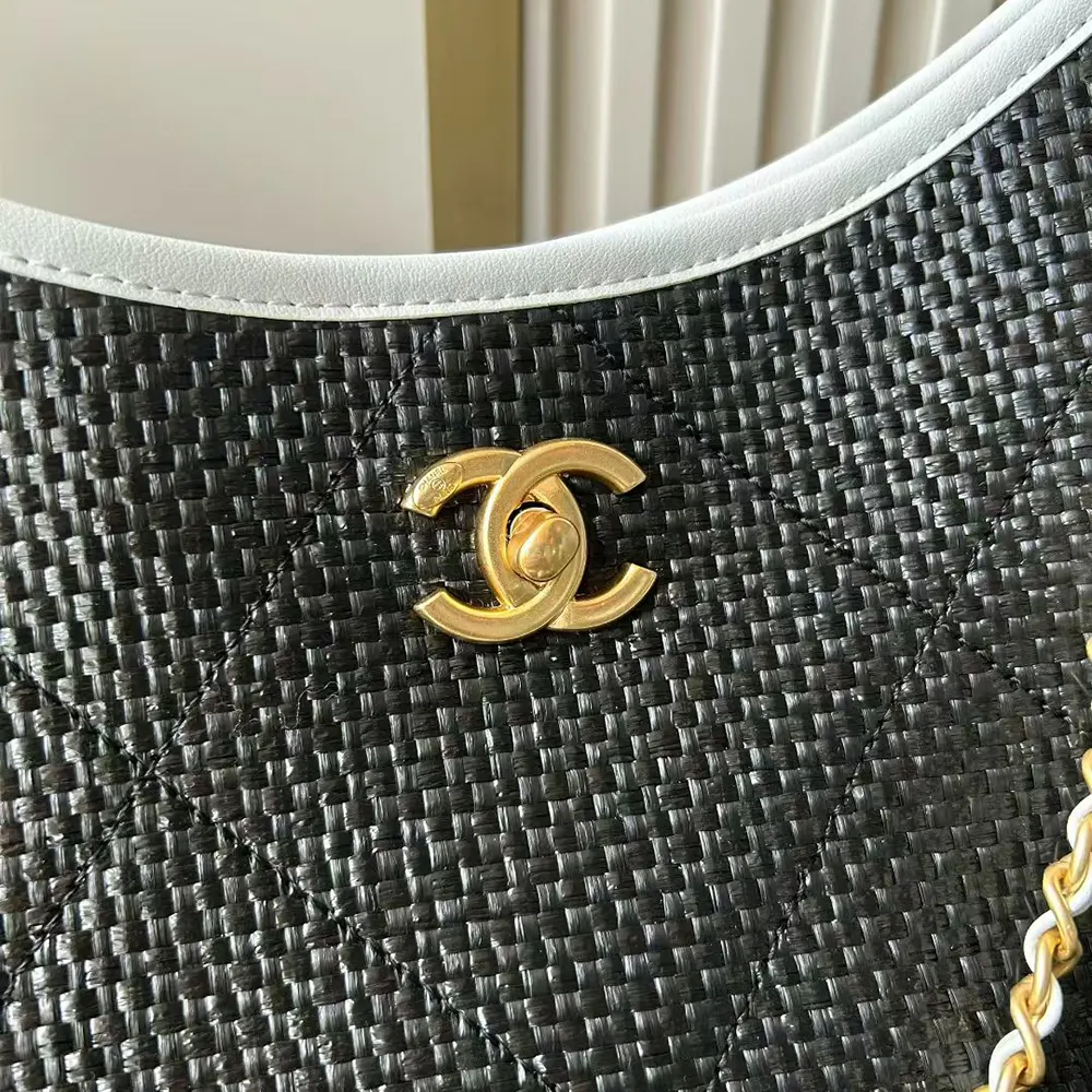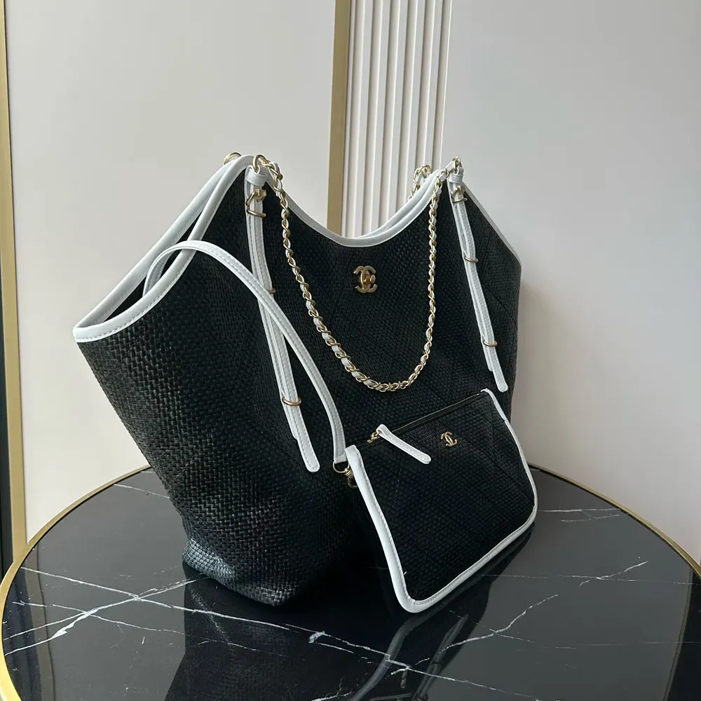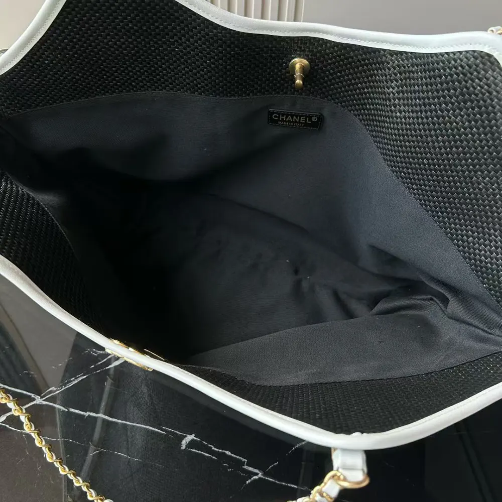 Chanel Women Maxi Shopping Bag Braided Raffia Calfskin & Gold-Tone Metal-Black