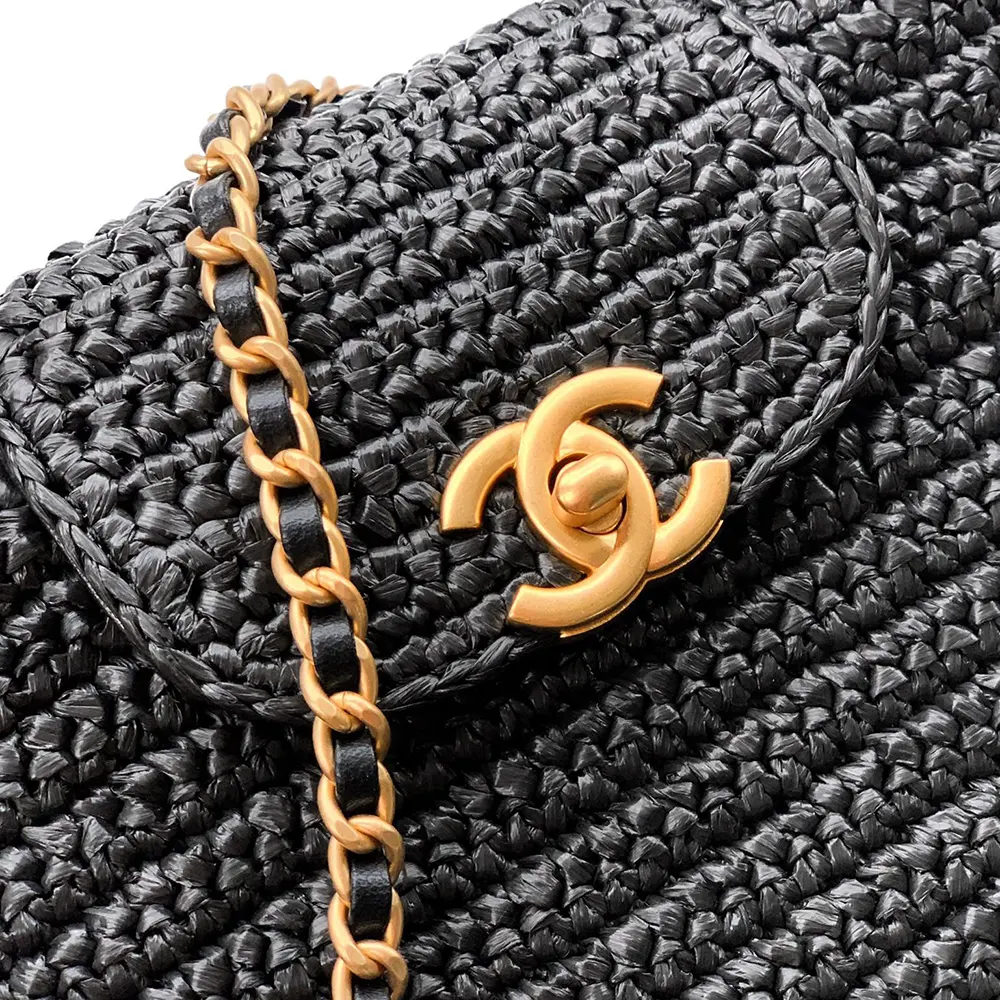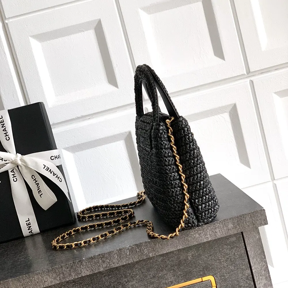 Chanel Women Mini Shopping Bag Braided Raffia & Gold-Tone Metal-Black