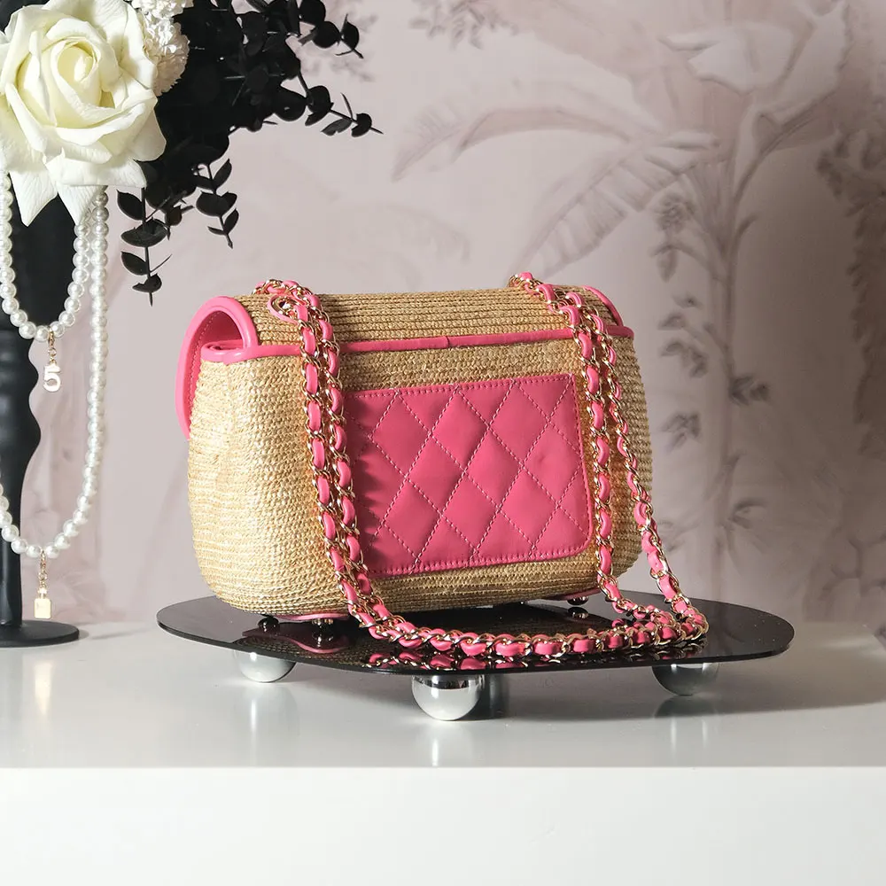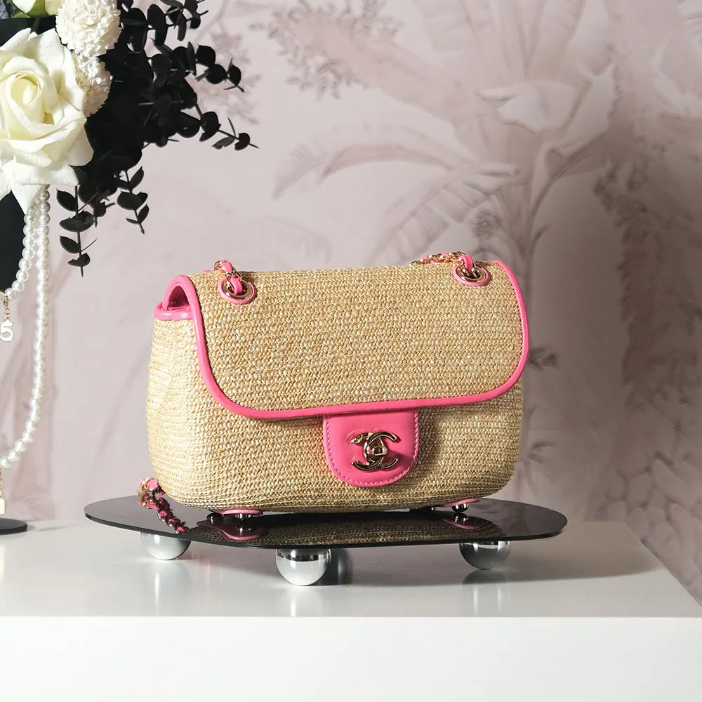 Chanel Women Small Flap Bag Braided Straw Lambskin & Gold-Tone Metal