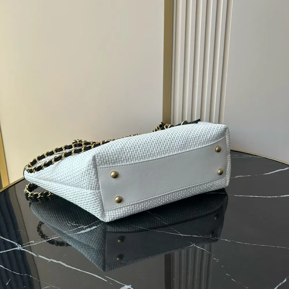Chanel Women Small Shopping Bag Braided Raffia Calfskin & Gold-Tone Metal-White