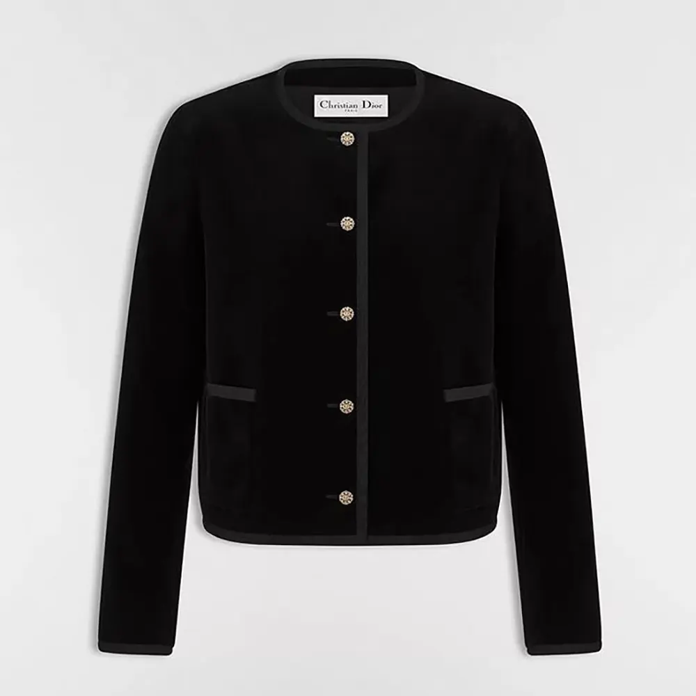 - Crafted in black cotton velvet, it has a cropped, laid-back silhouette embellished with Dior Tribales buttons, showcasing a CD signature silver-tone pearl inspired by the iconic House earring.