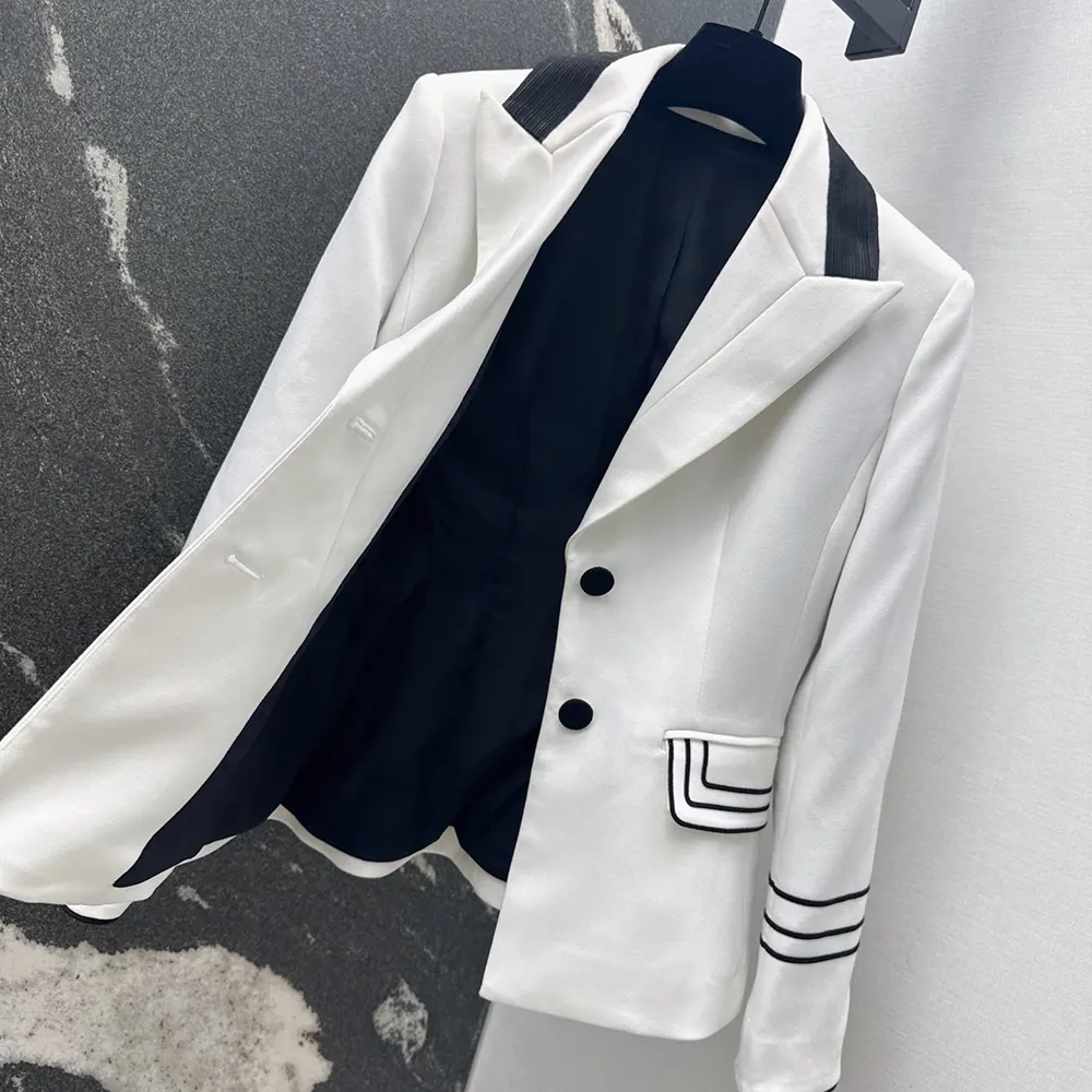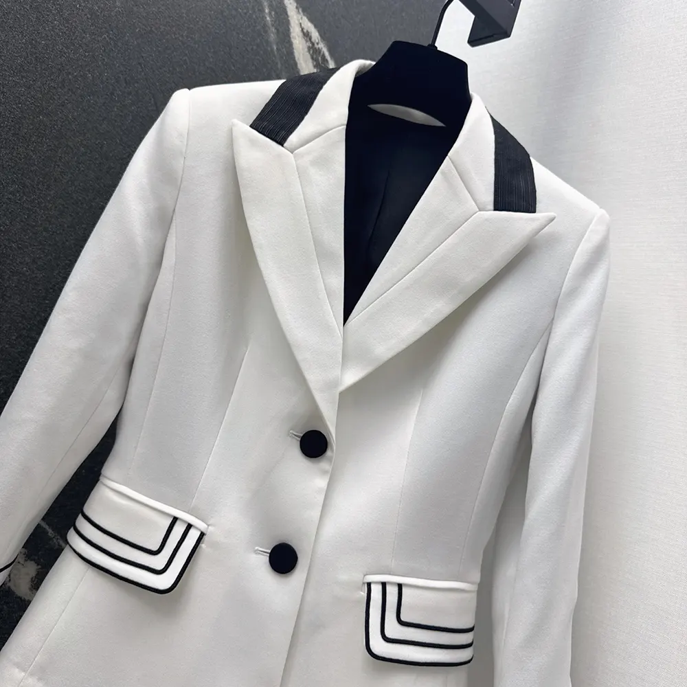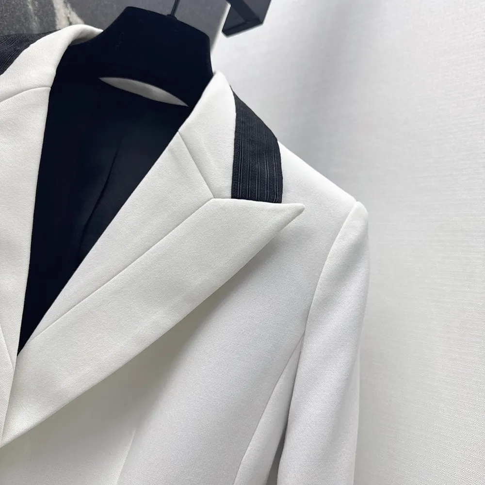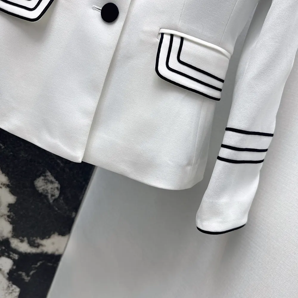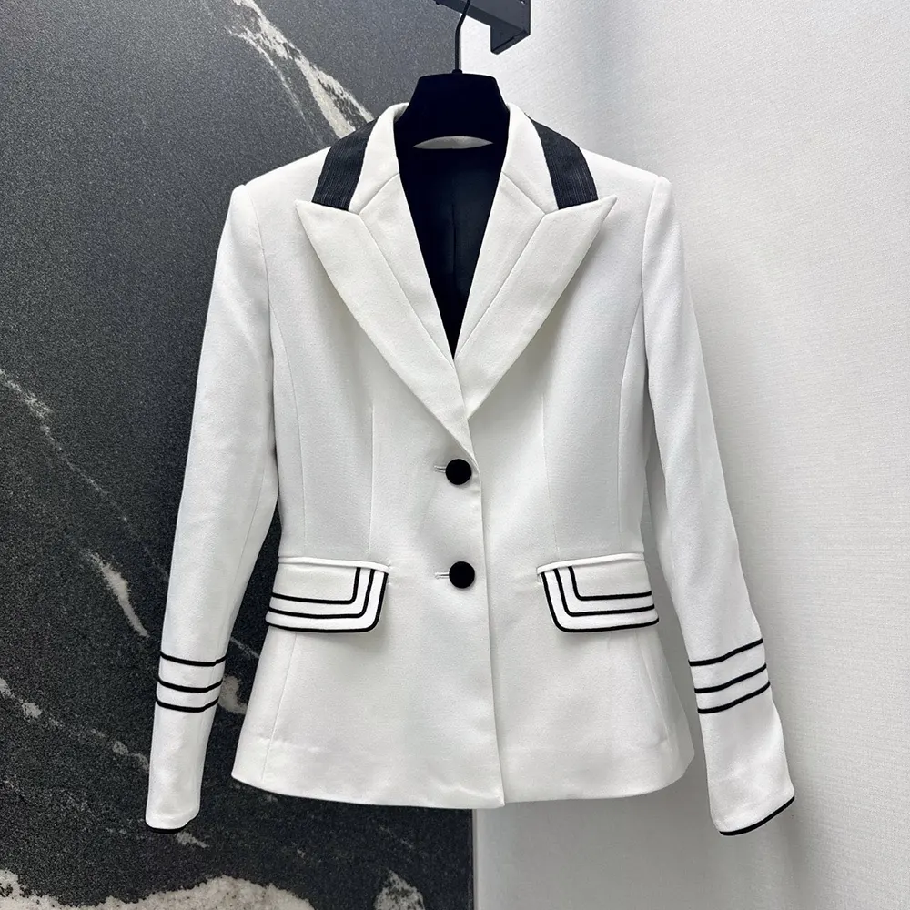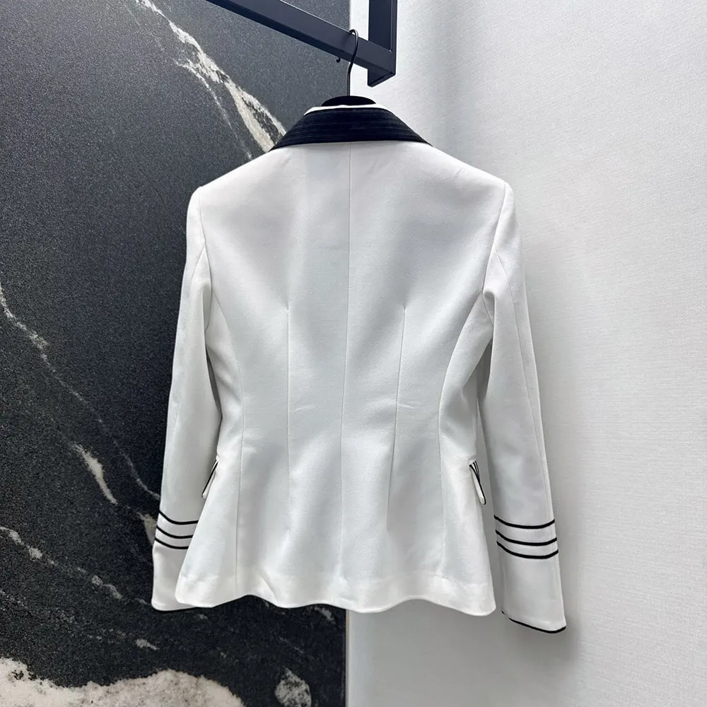 - Demonstrating the House’s exceptional savoir-faire, the officer collar is adorned with two hallmark embroidered bees, while black passementerie adds a delicately contrasting detail to the cuffs as well as the patch pockets highlighting the waist.