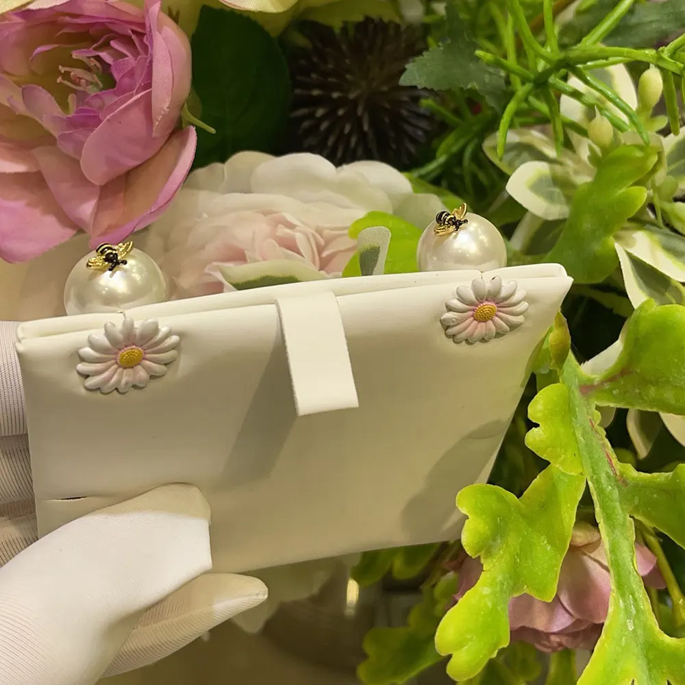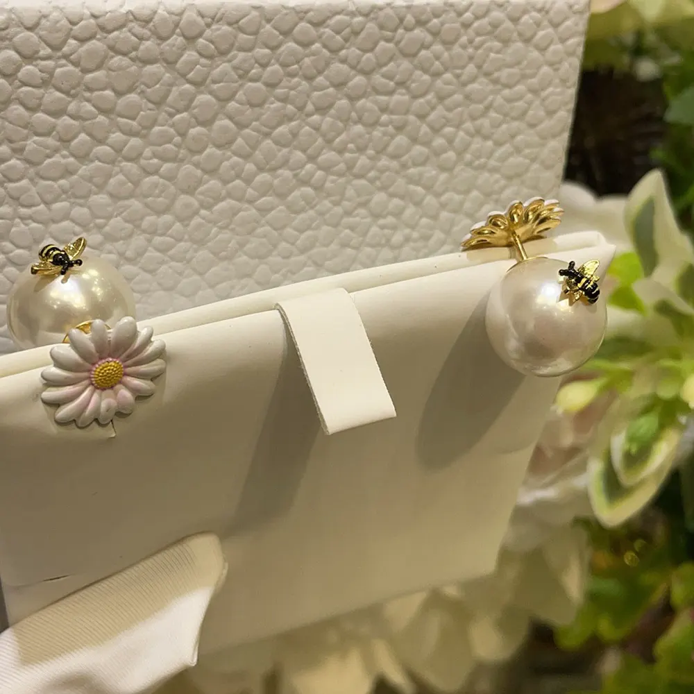 - The hallmark white resin pearls feature a Dior-engraved daisy in iridescent multicolor lacquer on the front, while the back is adorned with a delicately chiseled lacquered bee.