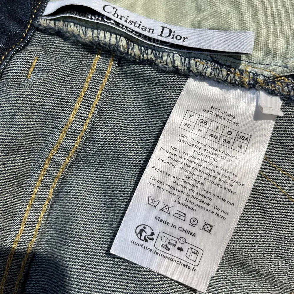 - Made in blue stonewashed cotton denim, it has a straight cut with side slit pockets and rear patch pockets, as well as a Dior jacron label on the back.