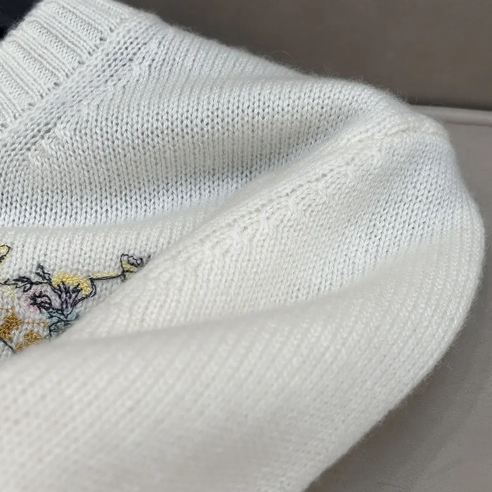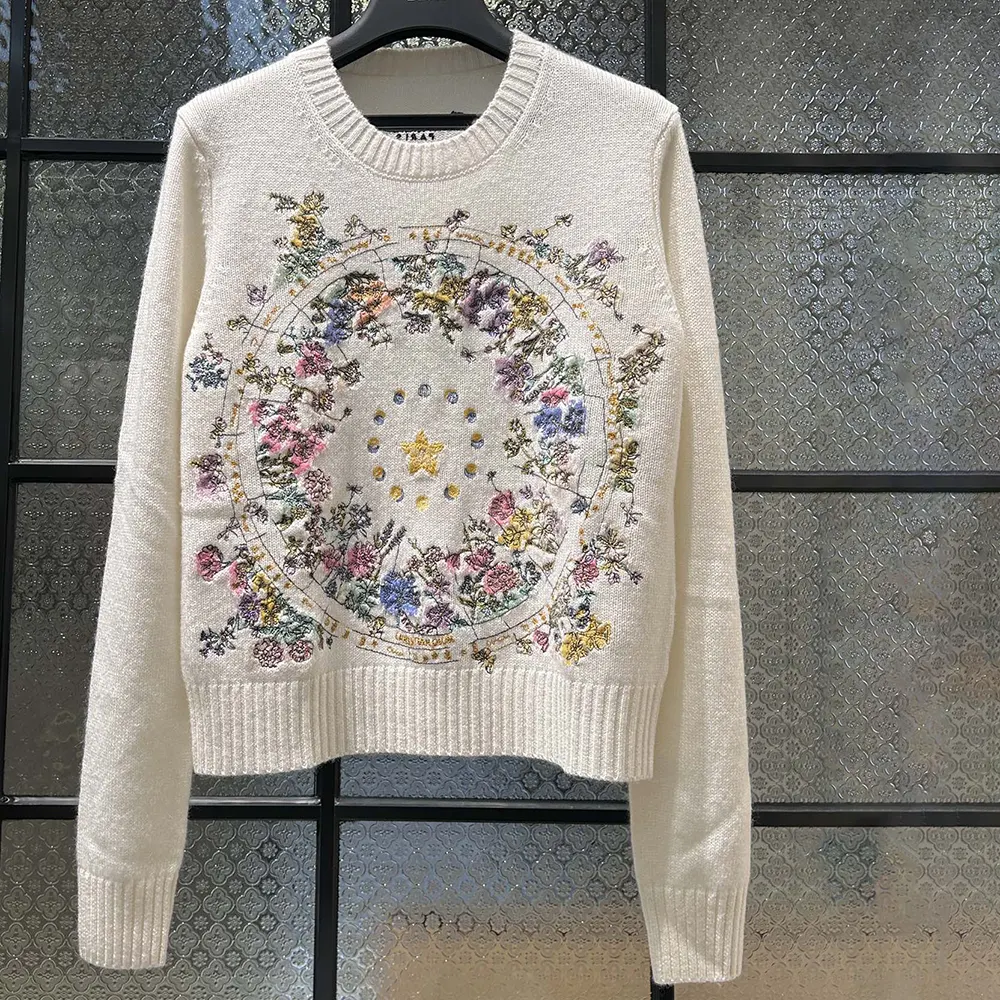 Dior Women Embroidered Sweater White Cashmere Knit with Multicolor Dior Astral Flowers Motif