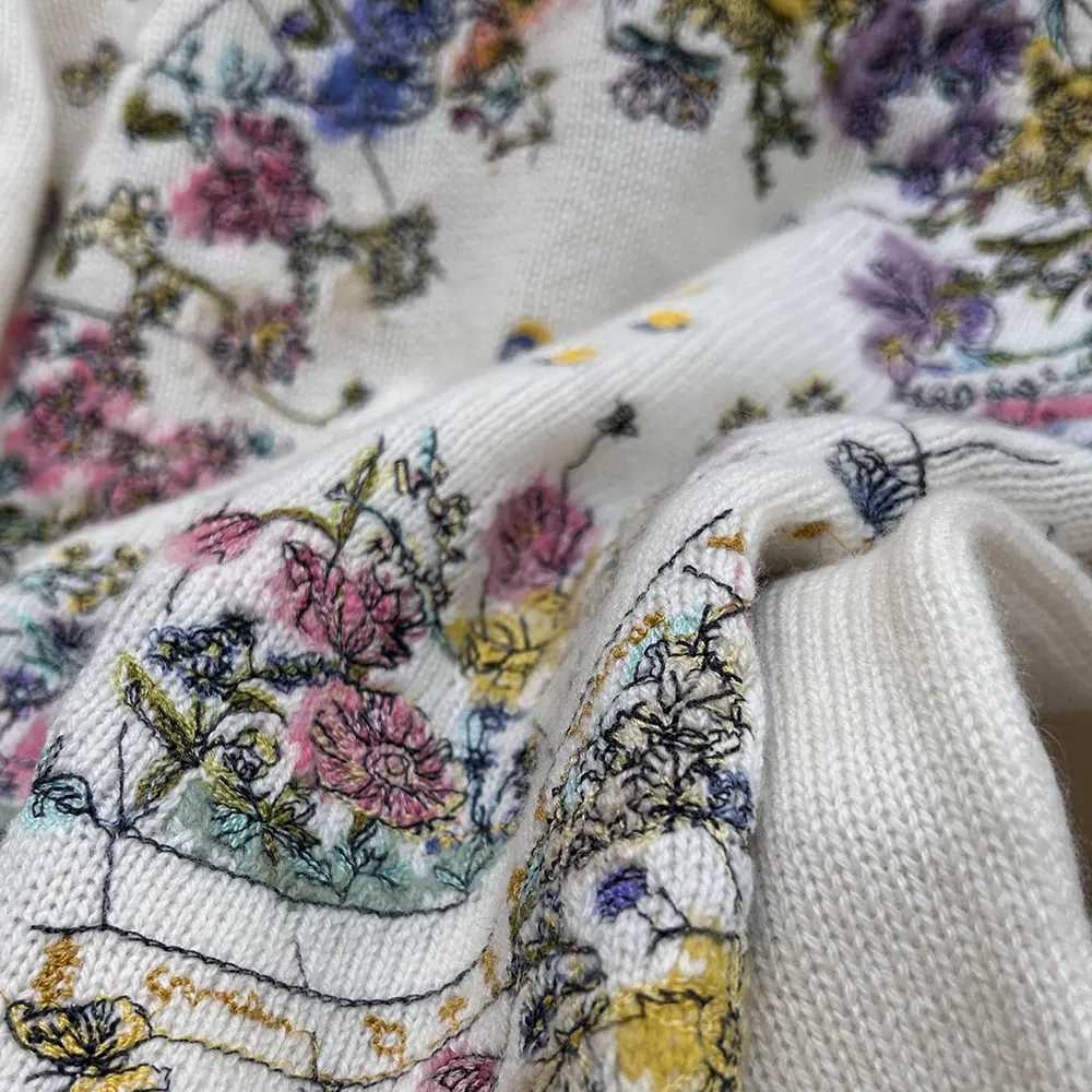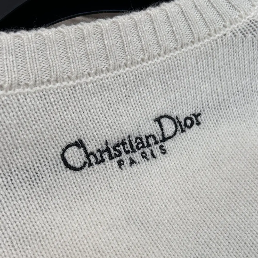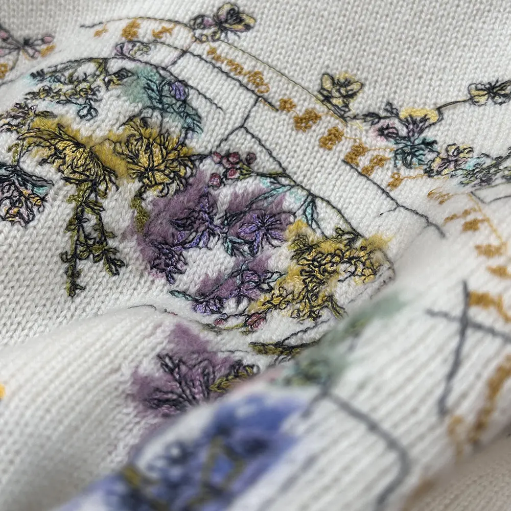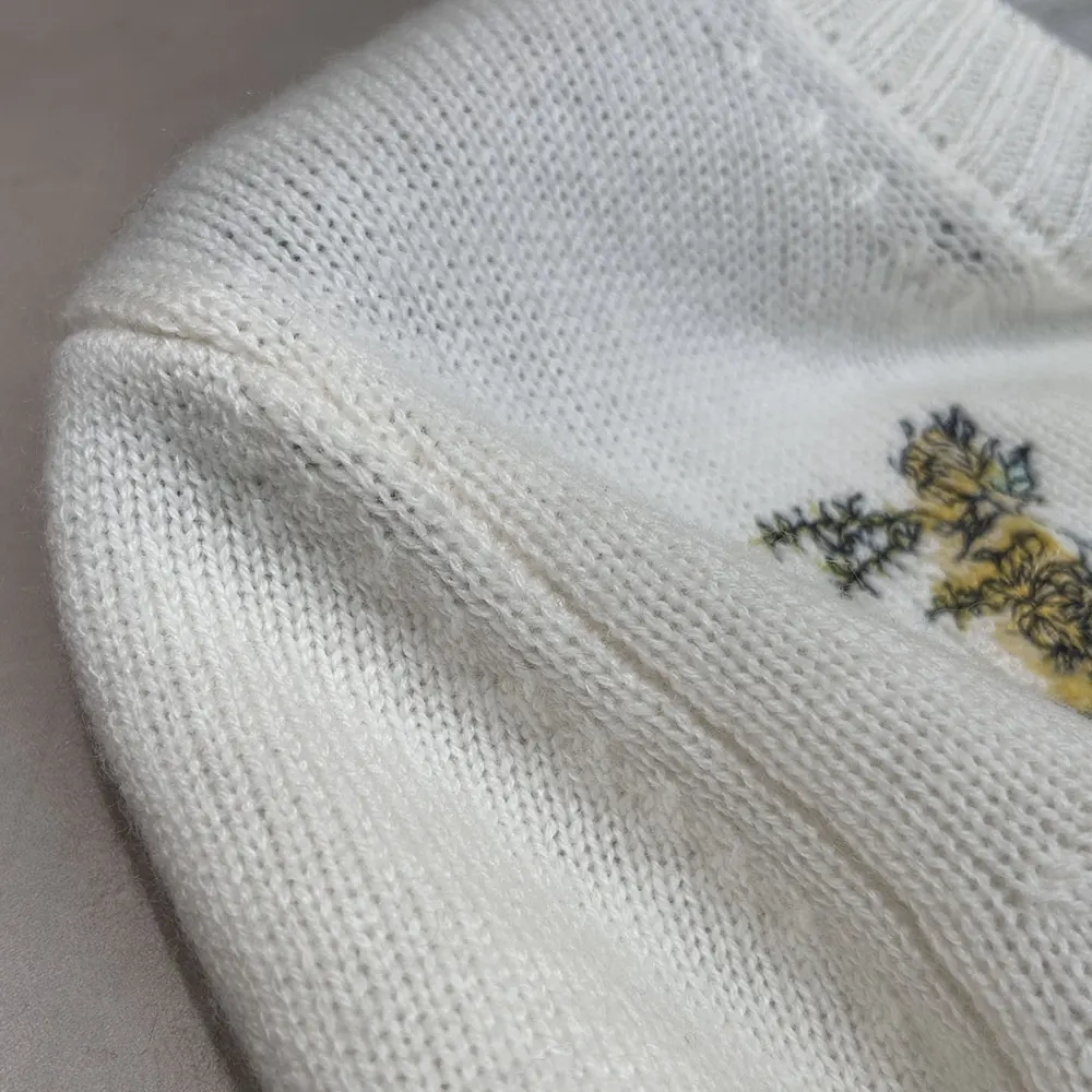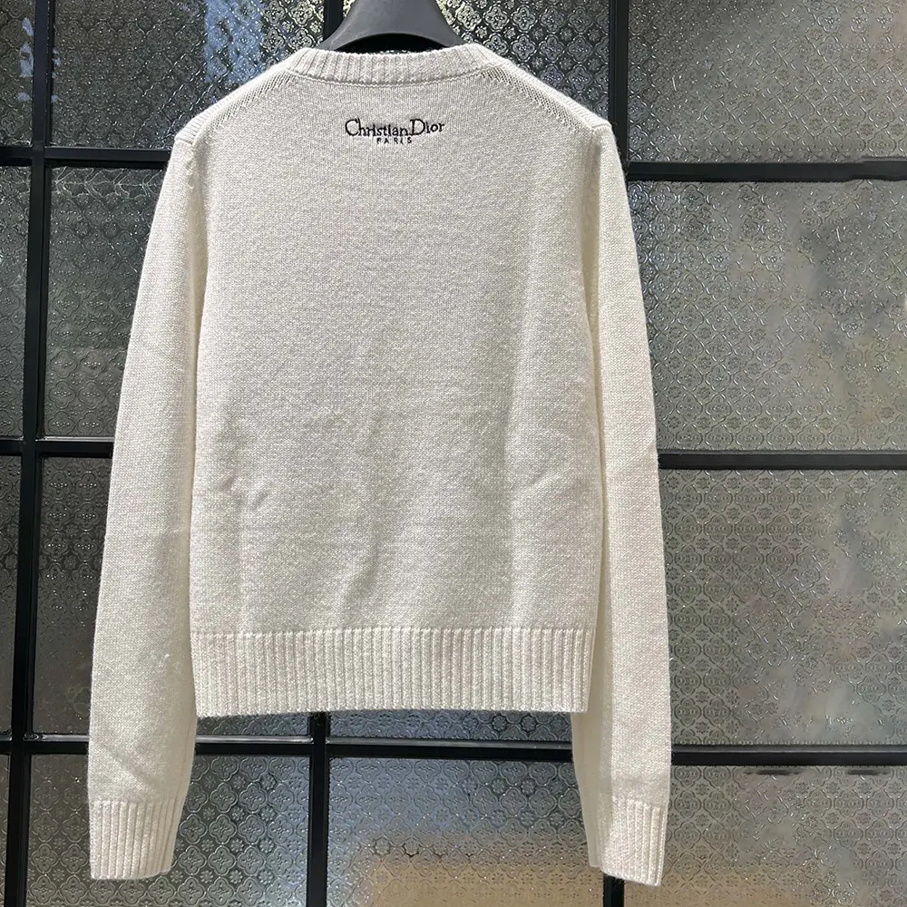 - The white cashmere-knit sweater is embroidered with a multicolor Dior Astral Flowers motif,
