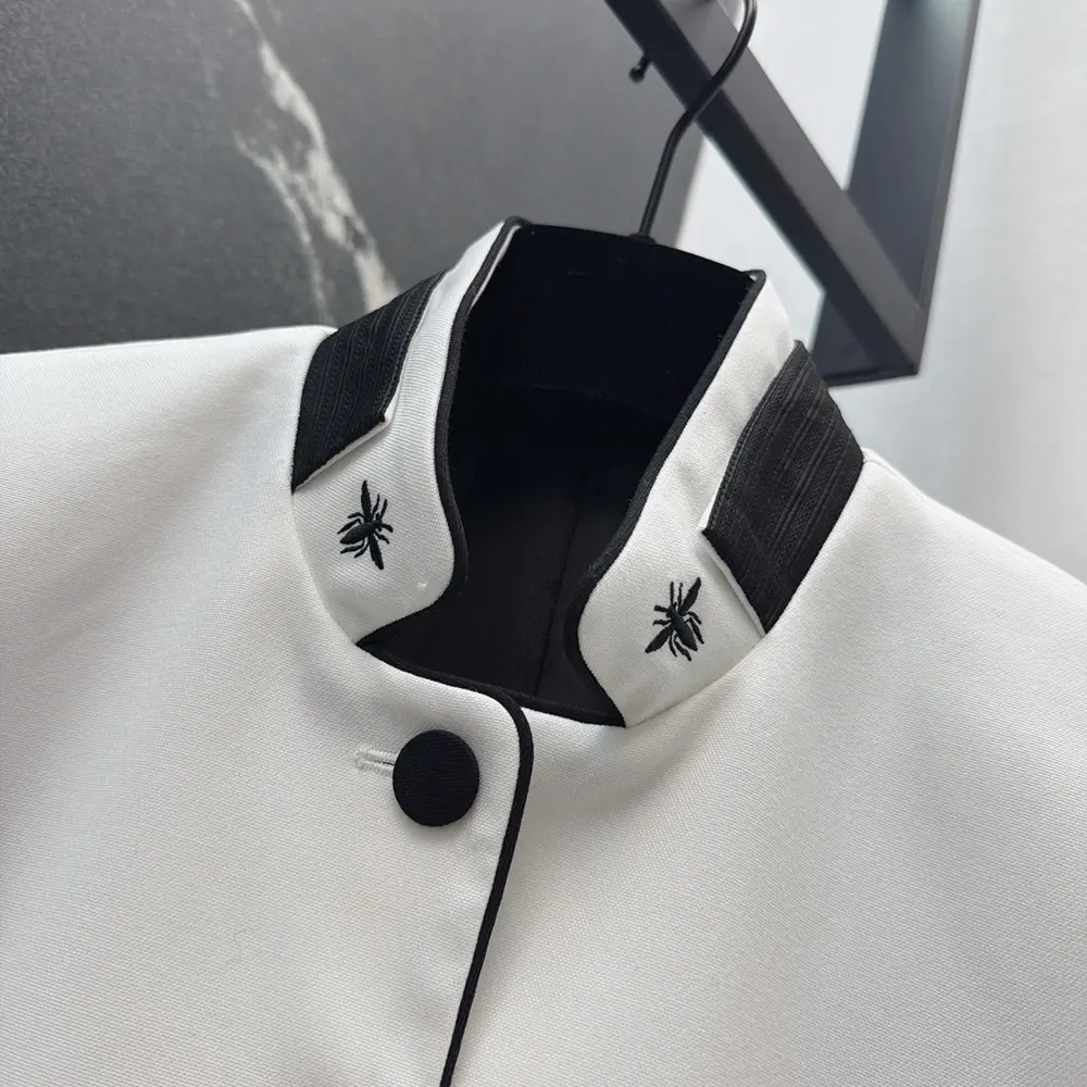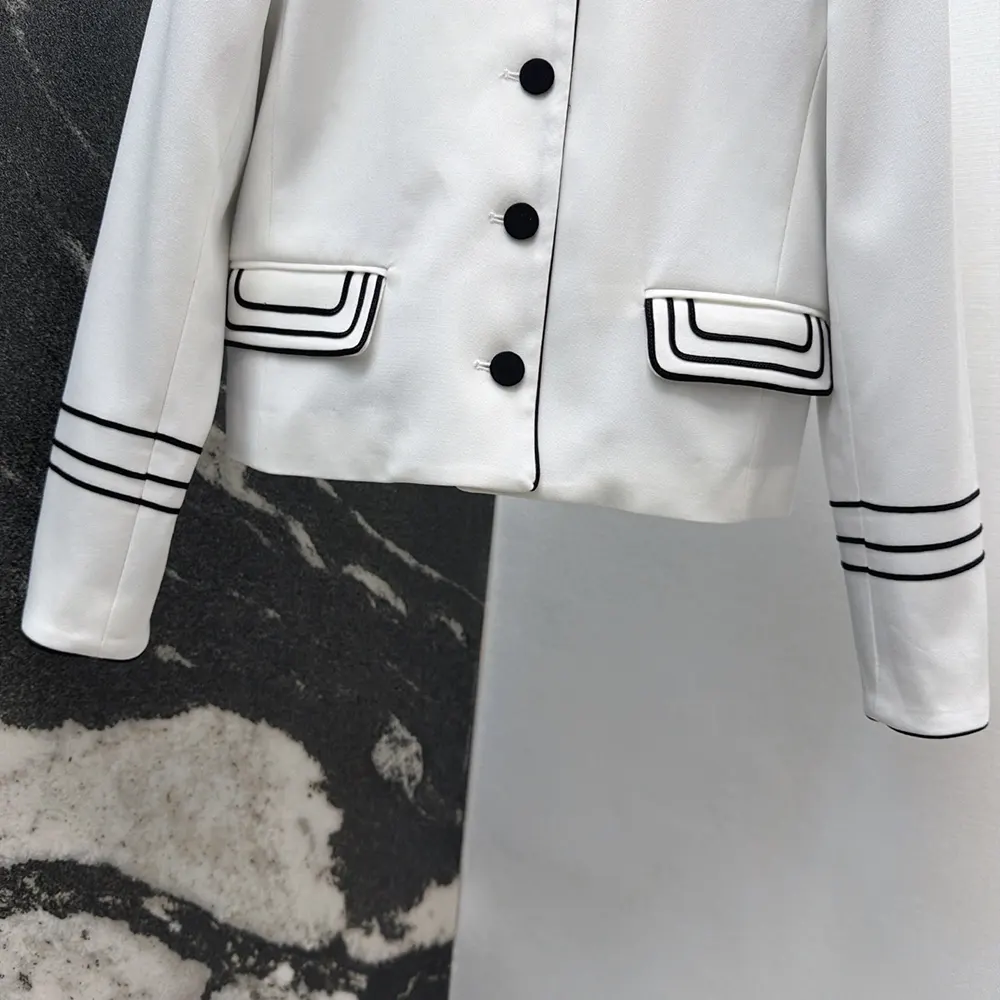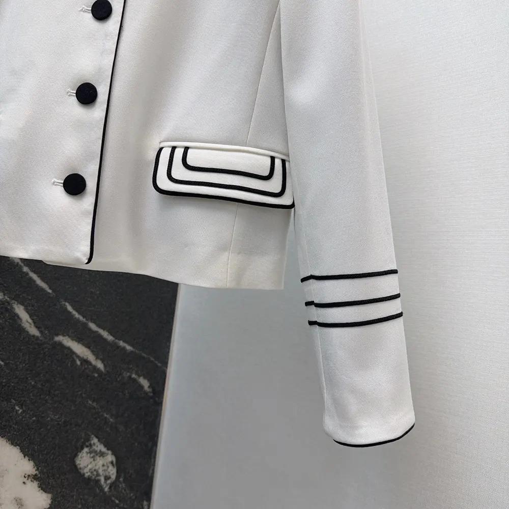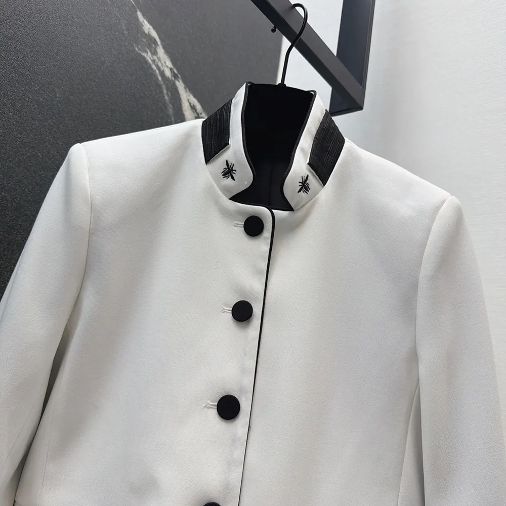 - Demonstrating the House’s exceptional savoir-faire, black passementerie adds a delicate contrast to the collar and cuffs as well as to the flap pockets highlighting the waist.