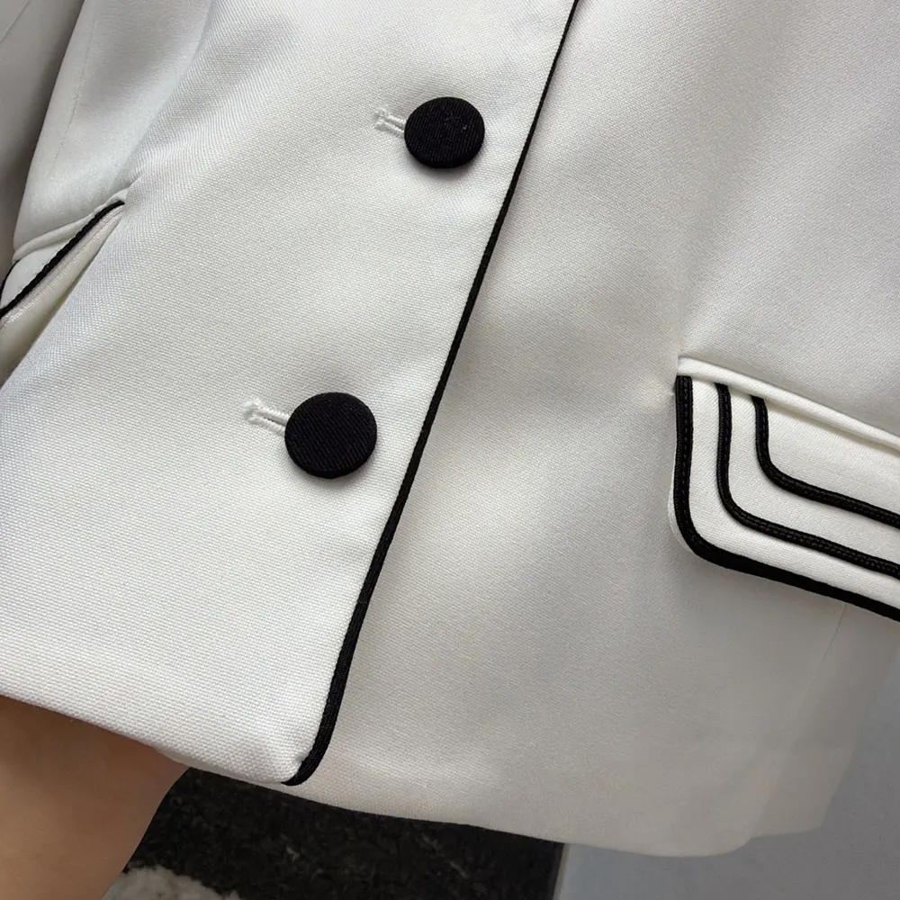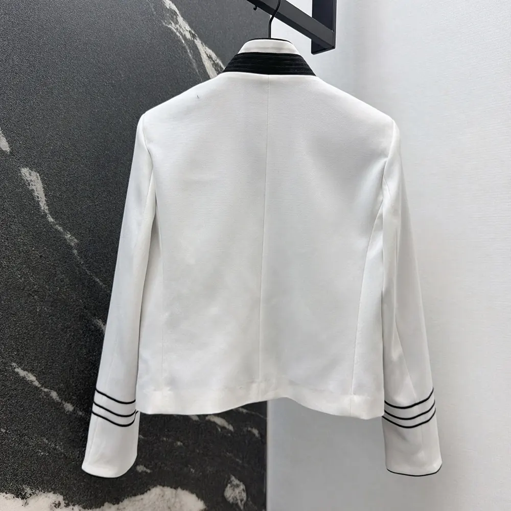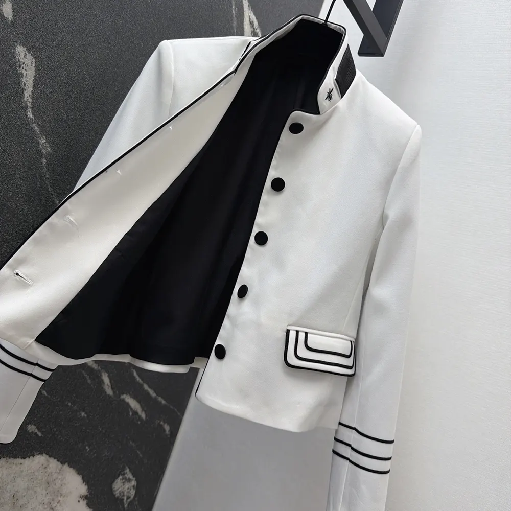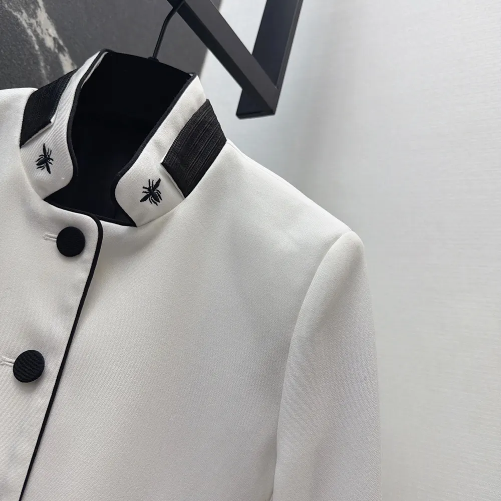 - Demonstrating the House’s exceptional savoir-faire, black passementerie adds a delicate contrast to the collar and cuffs as well as to the flap pockets highlighting the waist.