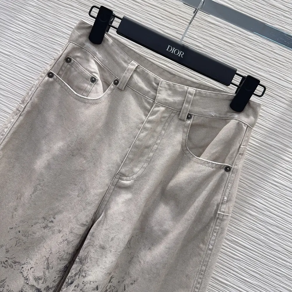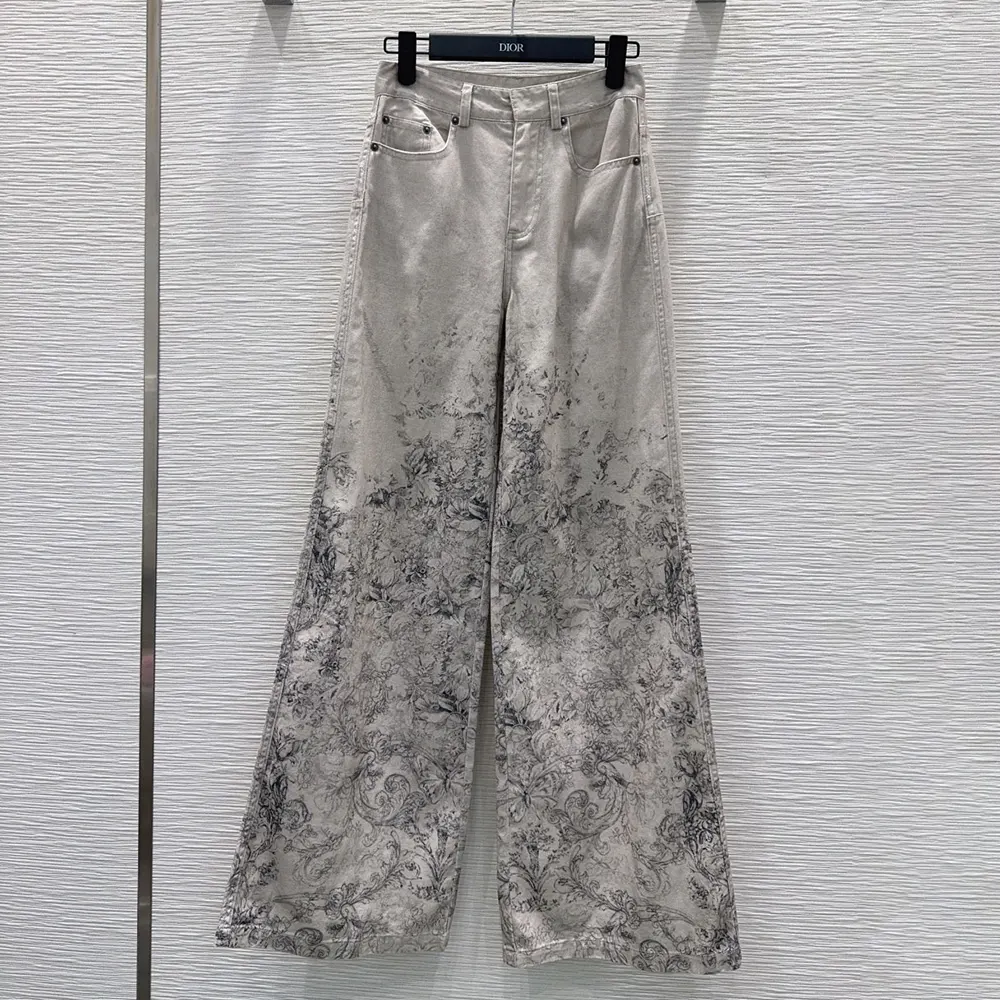 - The denim pants showcase the Dior Barocco motif, drawing inspiration from the collection’s flagship theme with flowers, butterflies and delicate arabesques.