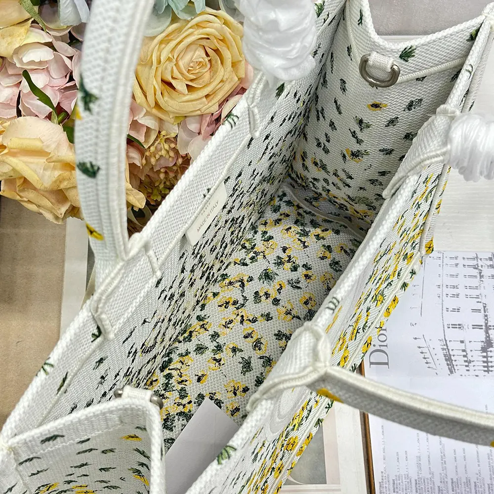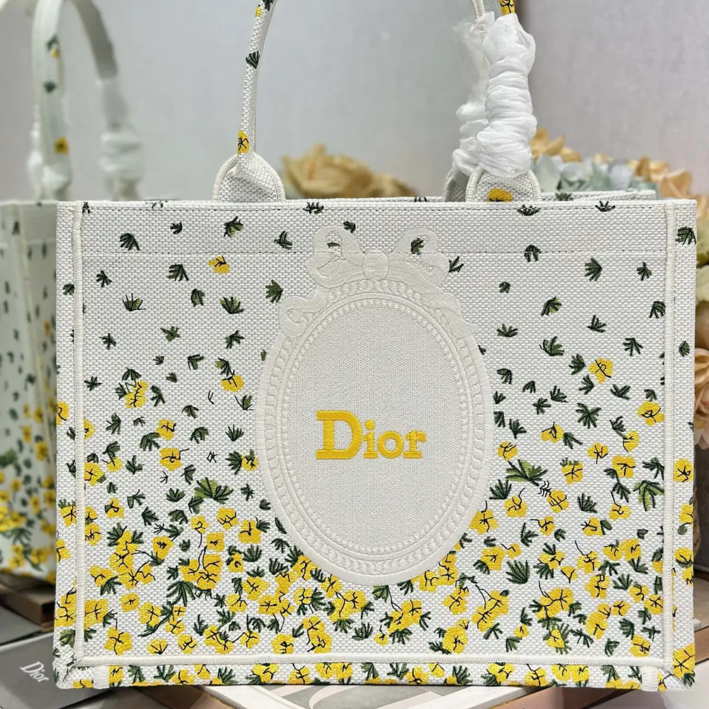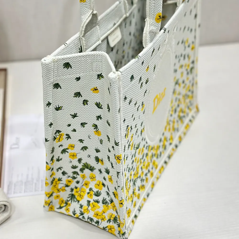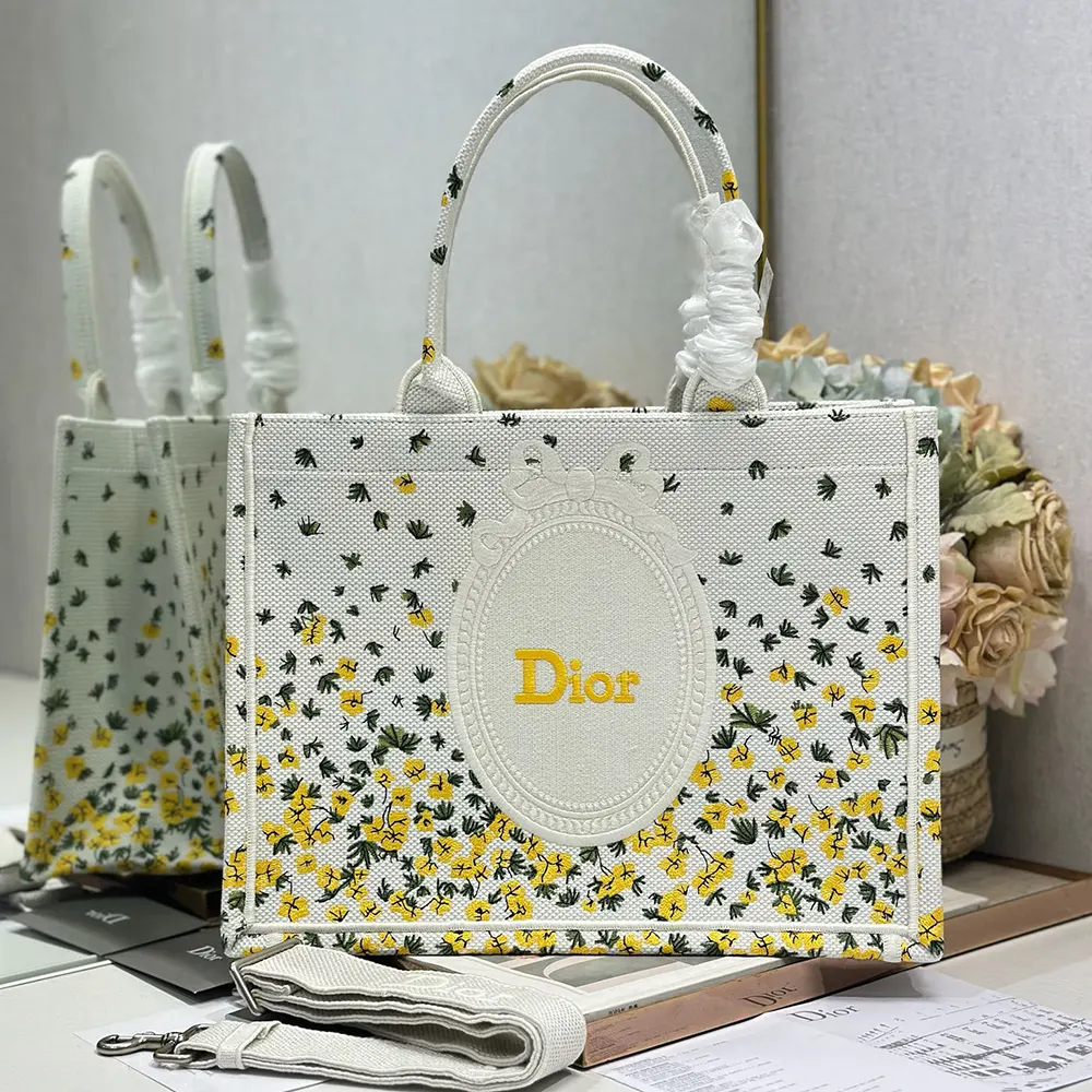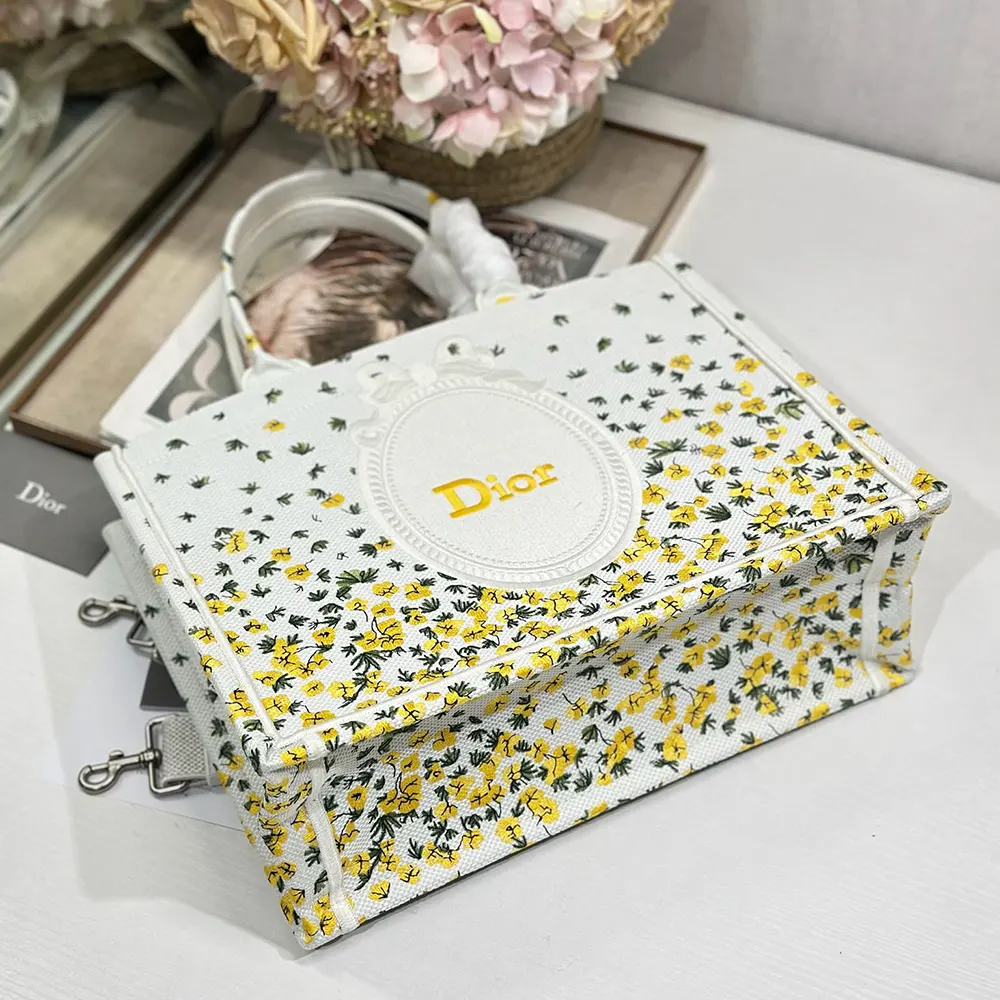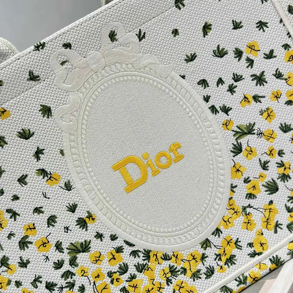 - Paying homage to Dior’s floral heritage, the hallmark Dior Book Tote embroidered with the Dior Buttercup motif showcases the whimsical emblem of Jonathan Anderson’s debut collection for the House.