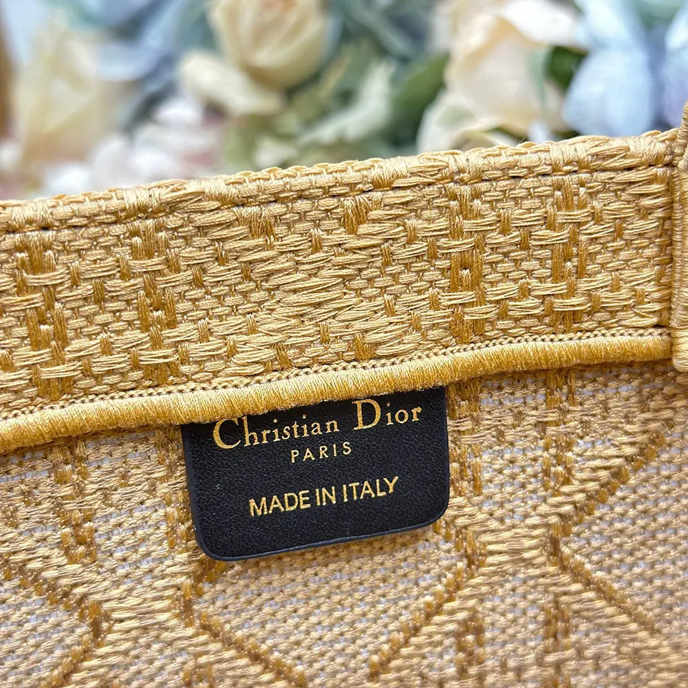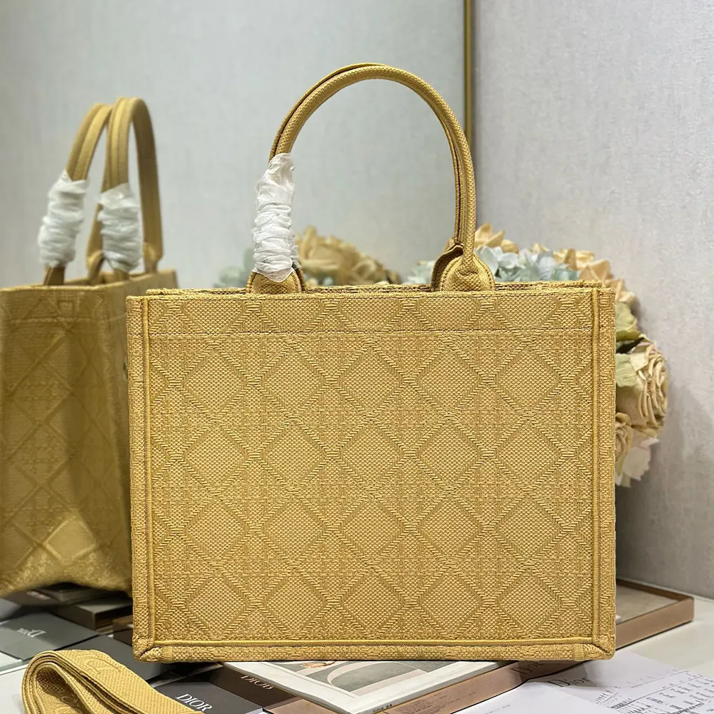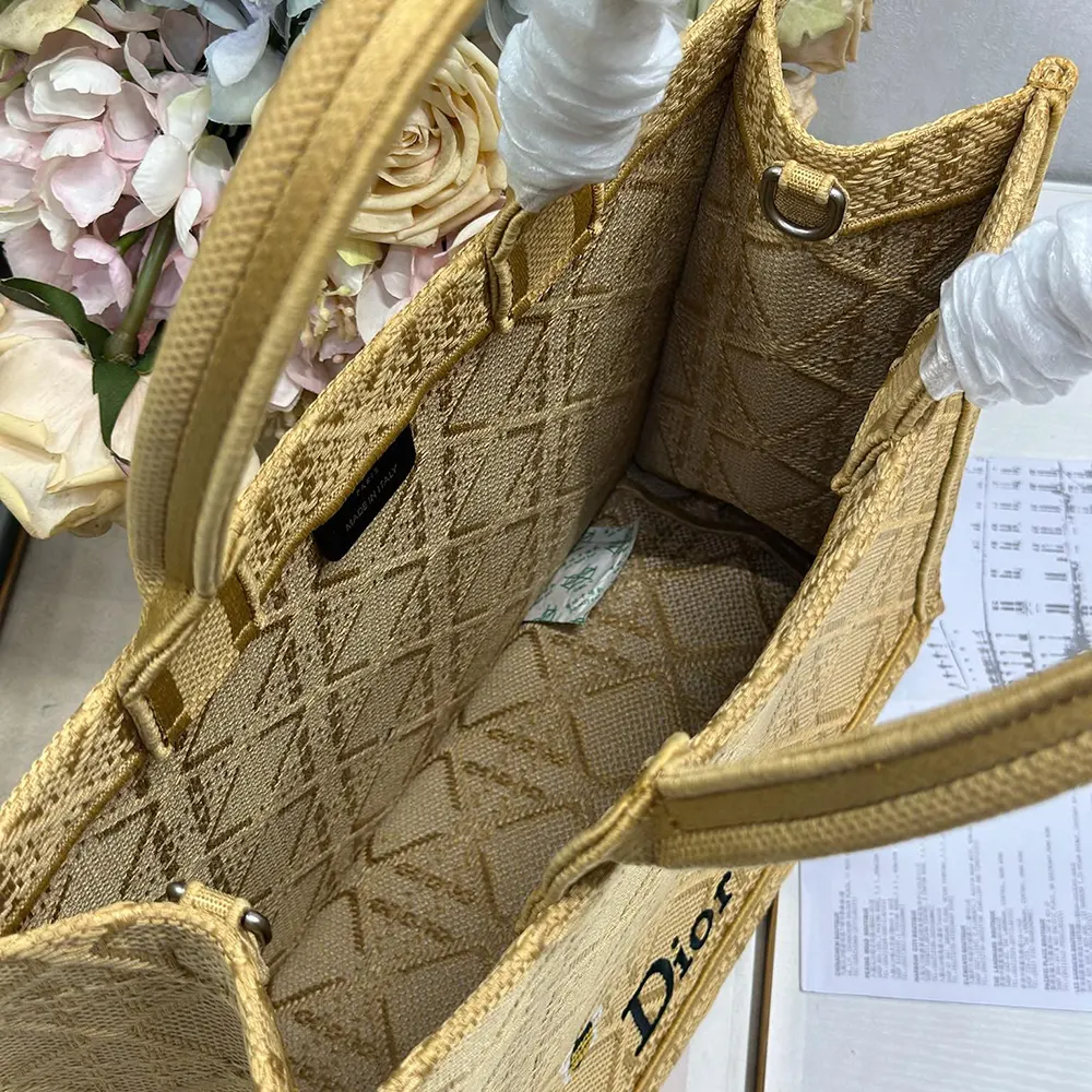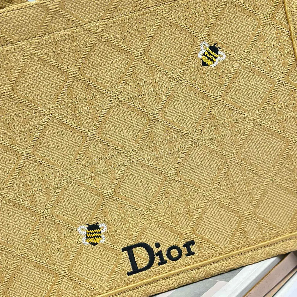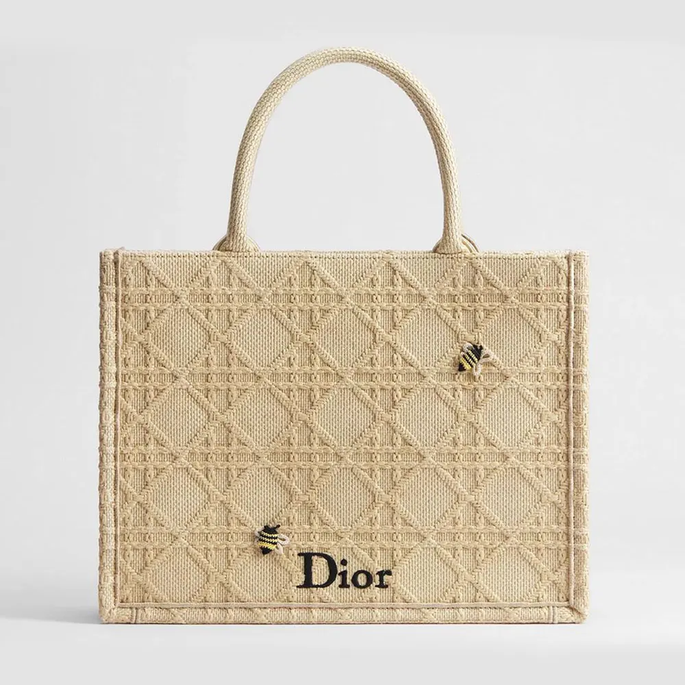 - The hallmark Dior Book Tote is reimagined in an embroidered raffia-effect variation with the Cannage motif, delicately enhanced by crocheted bees for a playful and colorful touch.