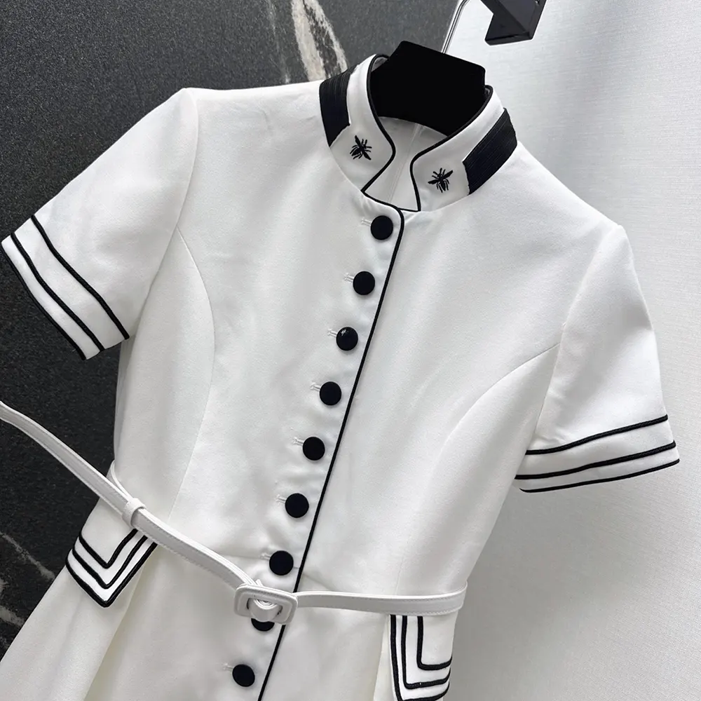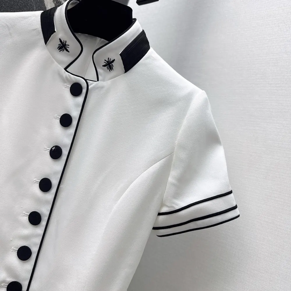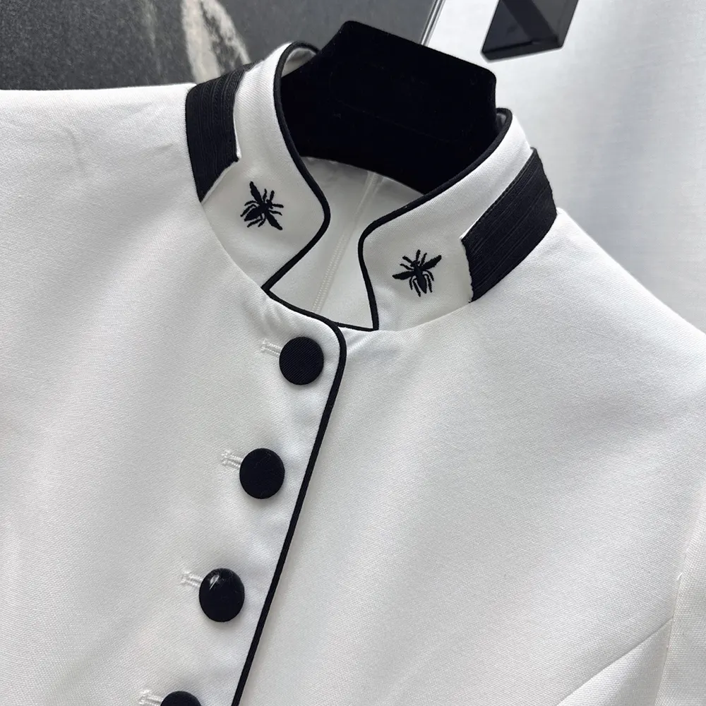 - Demonstrating the House’s exceptional savoir-faire, the officer collar is adorned with two hallmark embroidered bees, while black passementerie adds a delicate contrast to the waist and cuffs.