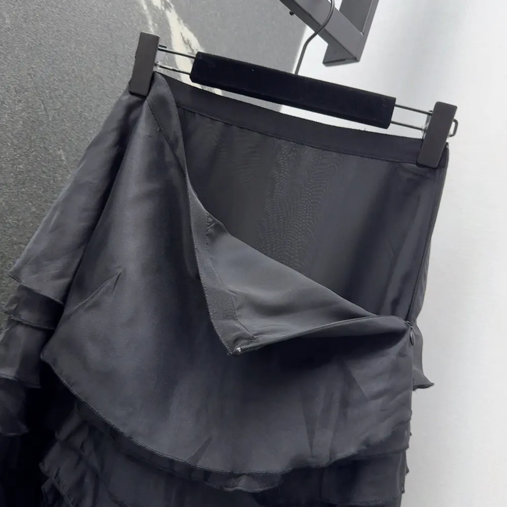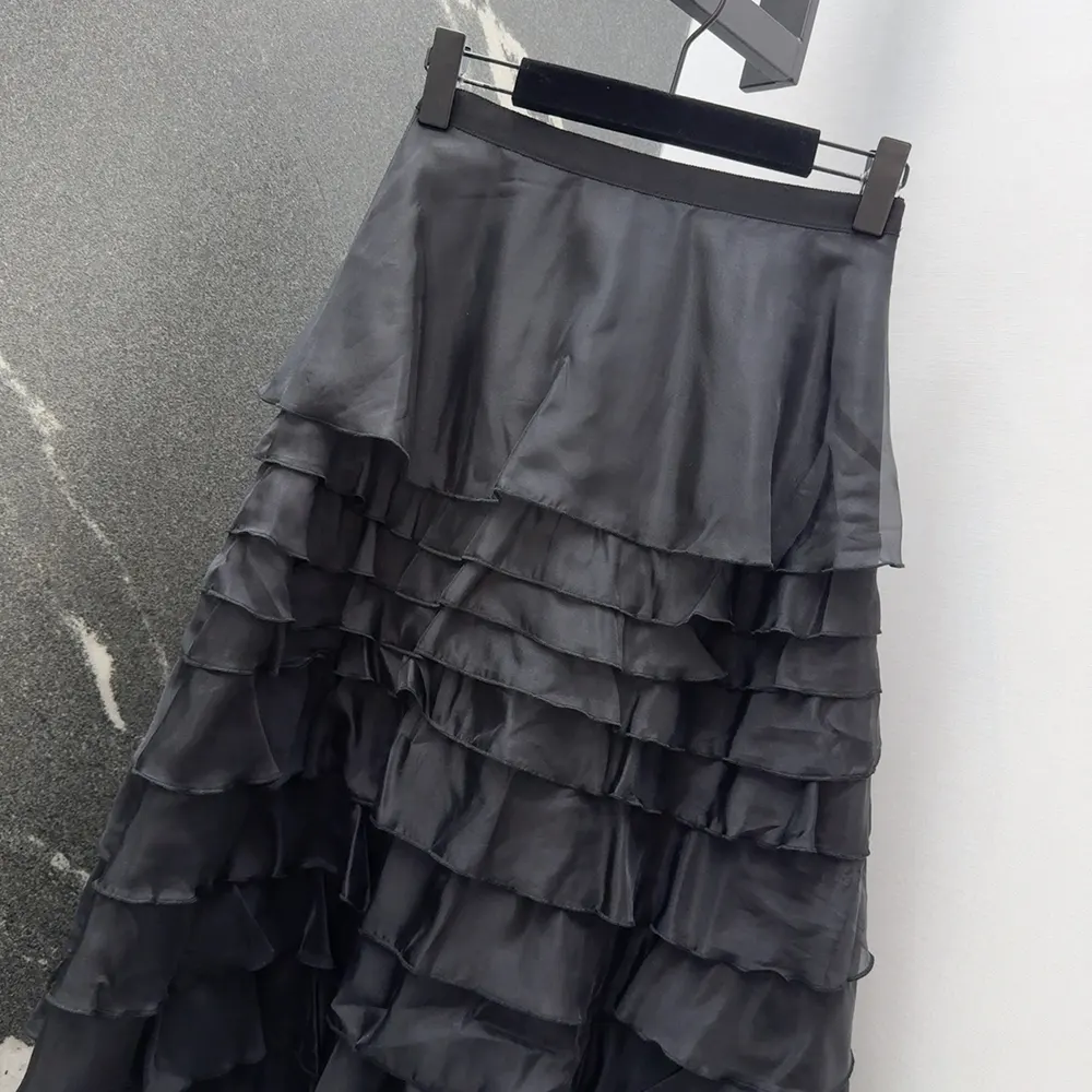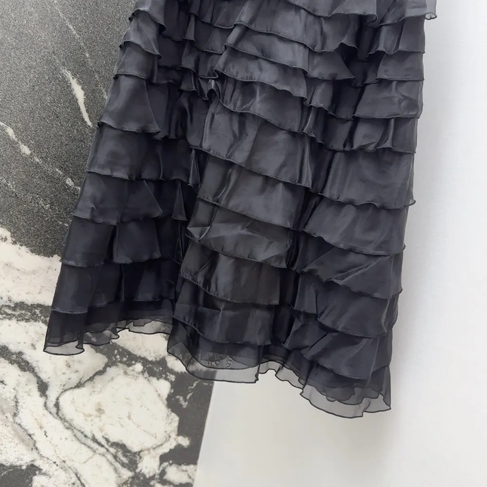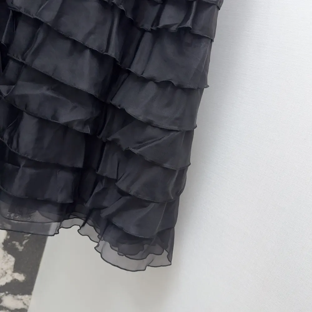 - Crafted in black silk organza, the design has a flared cut embellished with ruffled layers.