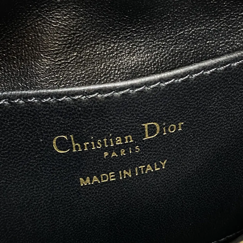 - Crafted in black lambskin with Macrocannage topstitching, it is enhanced by a gold-finish metal CD signature on the front and features a zip compartment to hold all the essentials.