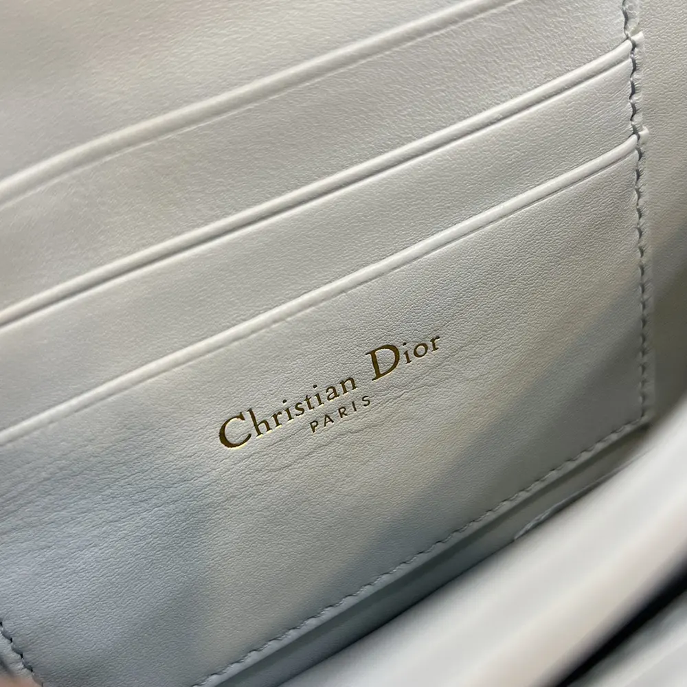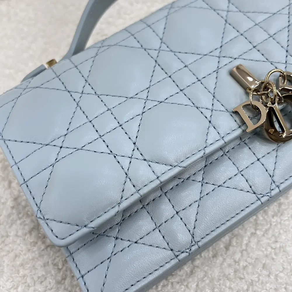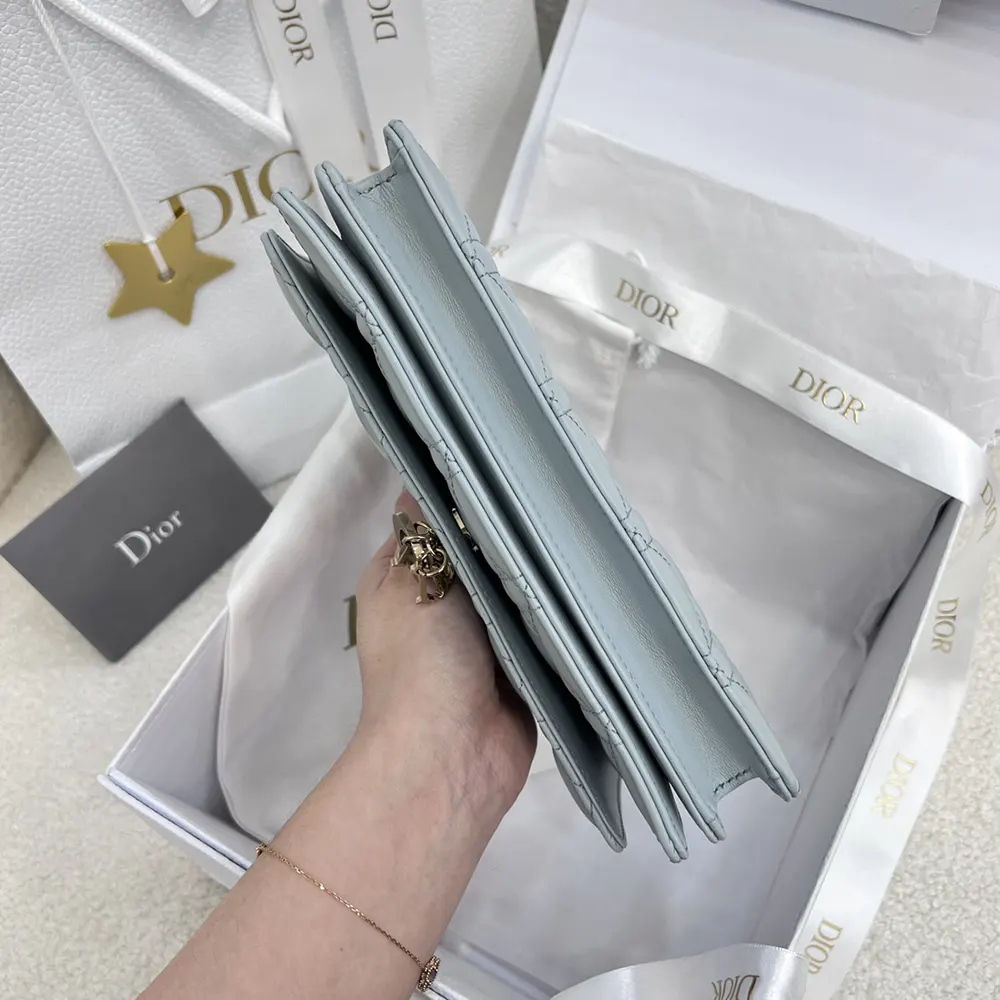 - Crafted in cloud blue Cannage lambskin, it features a flap enhanced by D.I.O.R. charms on the front.
