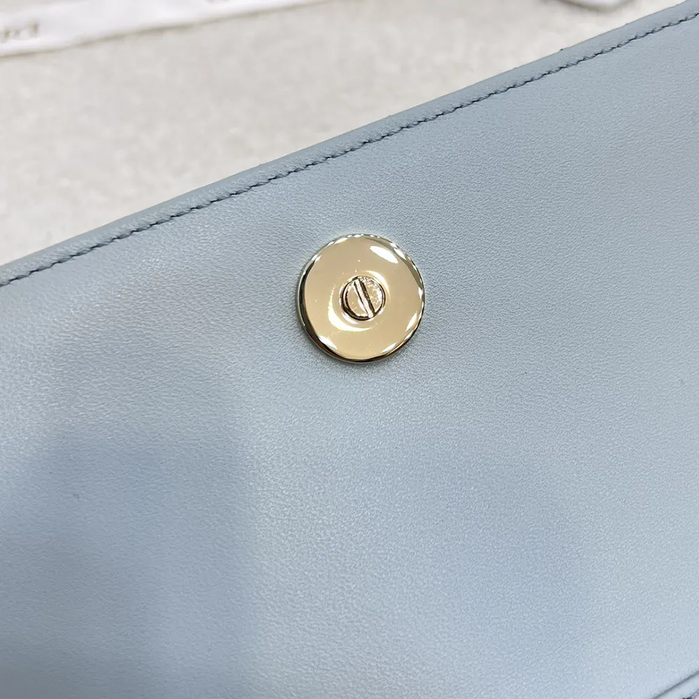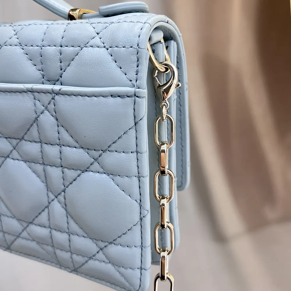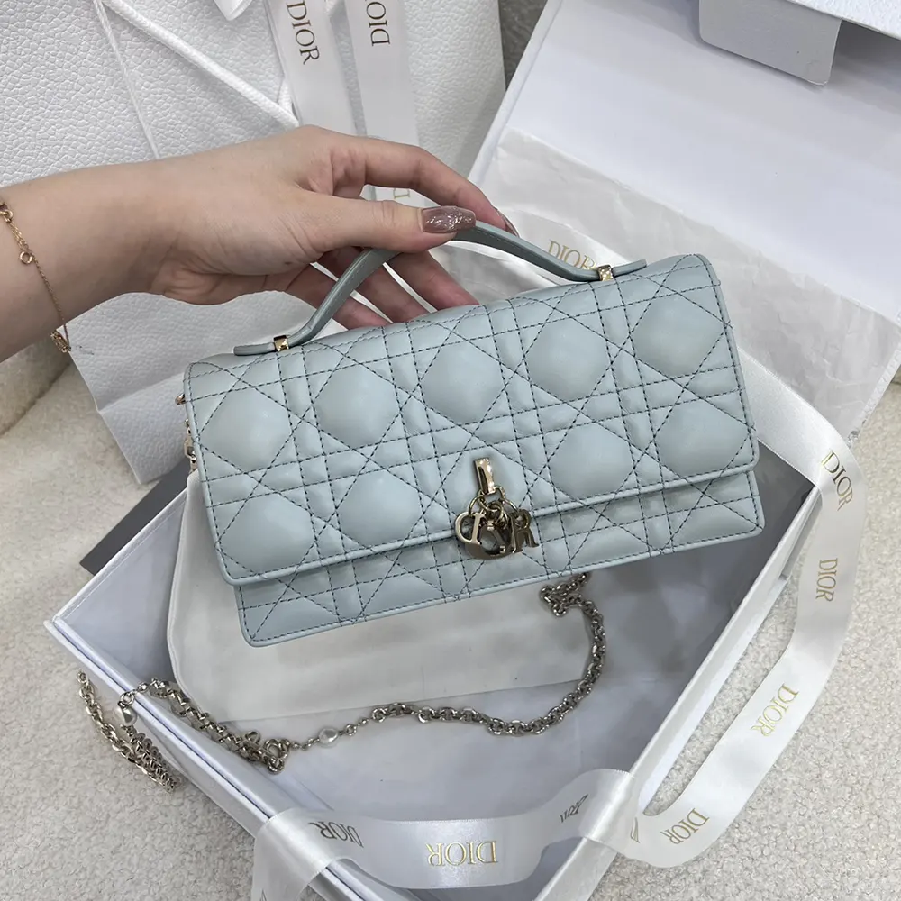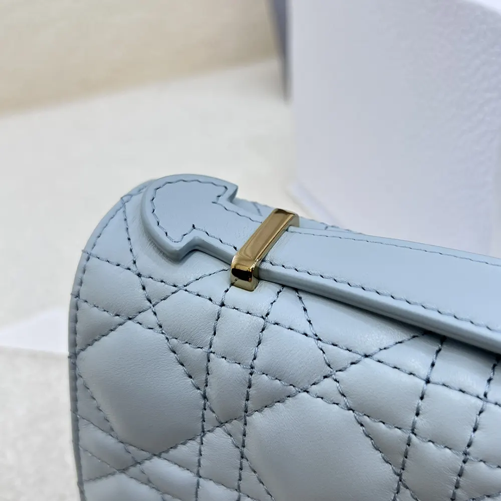 - Crafted in cloud blue Cannage lambskin, it features a flap enhanced by D.I.O.R. charms on the front.