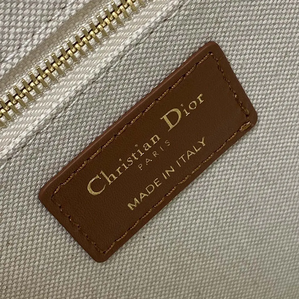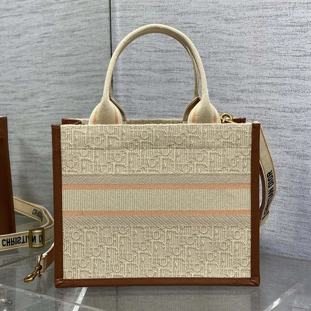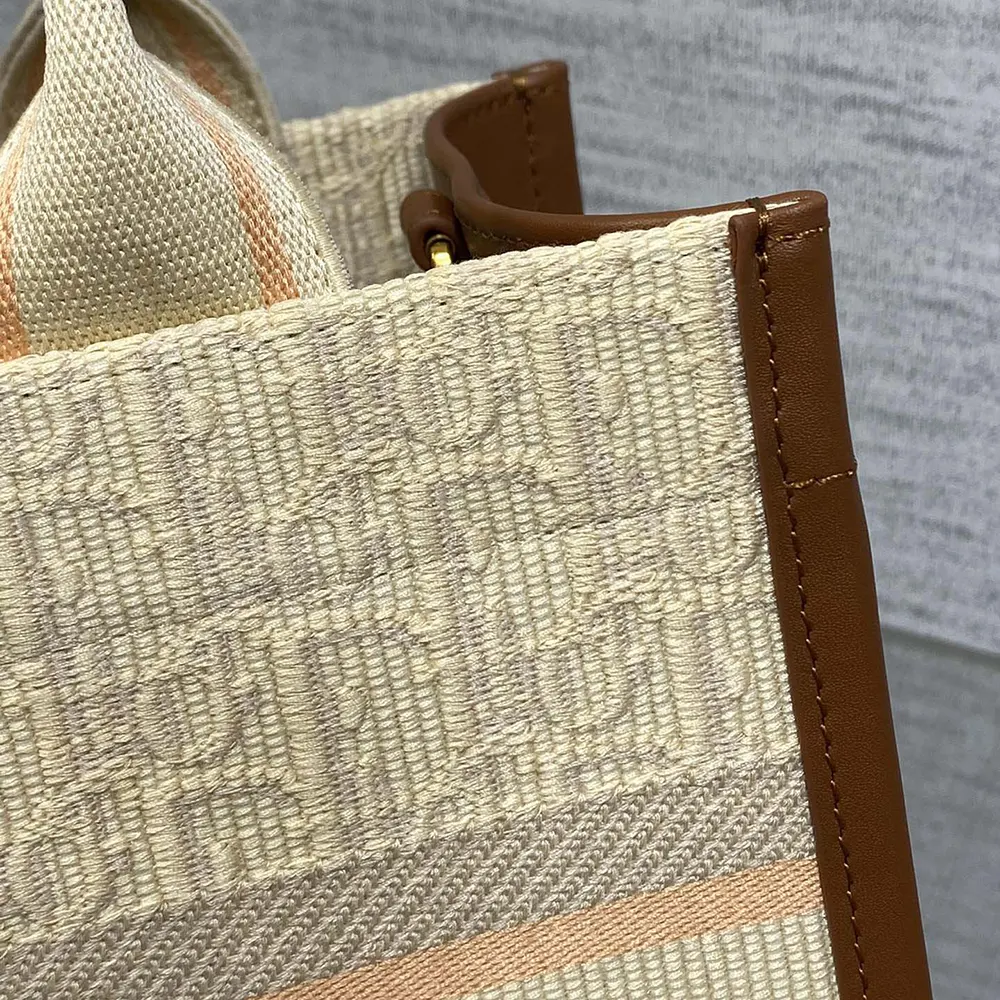 Dior Women Small Dior Book Tote Beige Dior Oblique Embroidered Raffia and Camel Calfskin