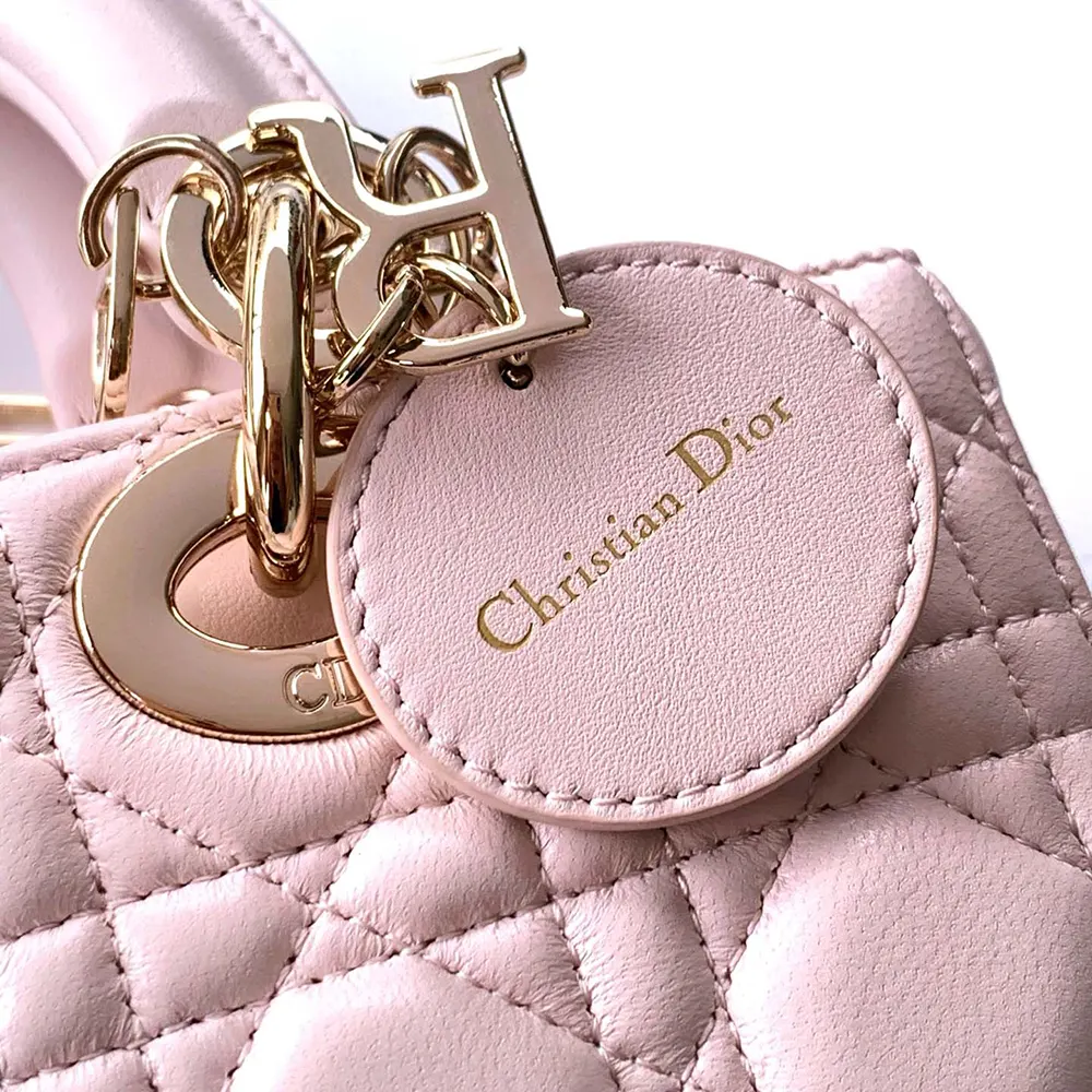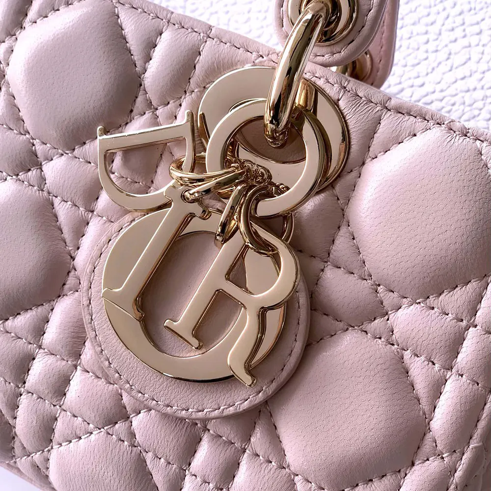 - the refined and timeless style is enhanced by pale gold-finish metal D.I.O.R. charms illuminating its silhouette.